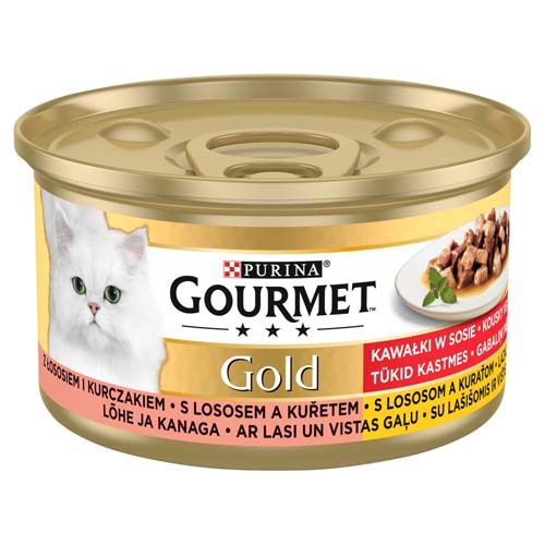 Jemné kousky kuřete a lososa ve výborné šťávě potěší jazýček každé mlsné kočky. Krmivo Gourmet Gold nabízí nejen požitek z každého krmení, ale zároveň posiluje organismus.