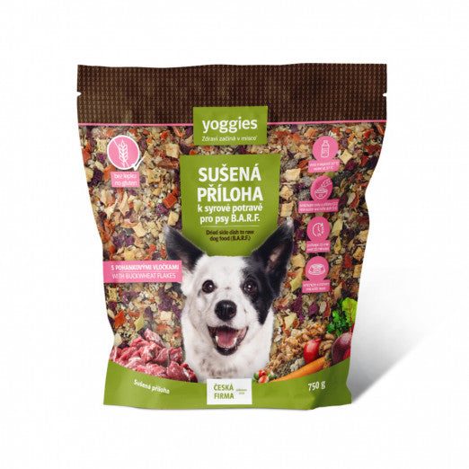 Doplňkové krmivo Yoggies sušená příloha s pohankovými vločkami je optimálním doplňkem ke krmení syrovým masem B.A.R.F.