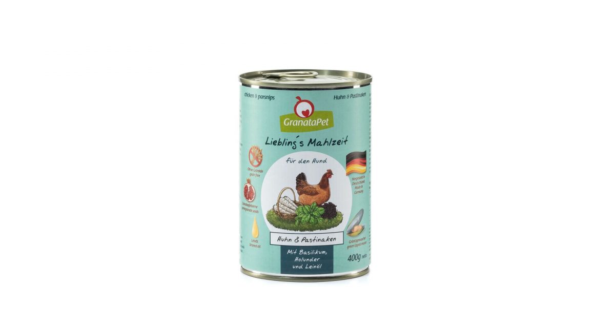 Konzerva GranataPet kuře s pastinákem, bazalkou, bezinkou a lněným olejem pro ocelové zdraví vašeho parťáka