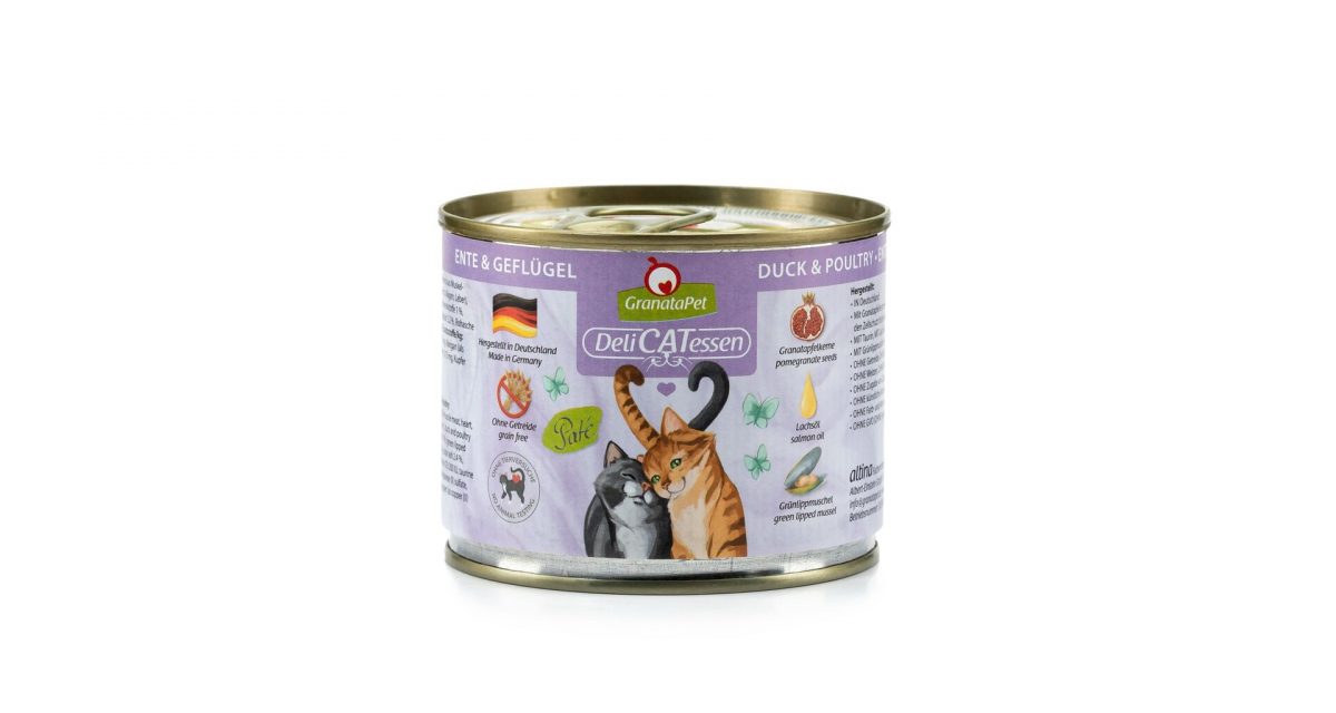 Vyvážená receptura kachní konzervy pro kočky GranataPet nabitá živinami potěší i náročné kočičí strávníky.