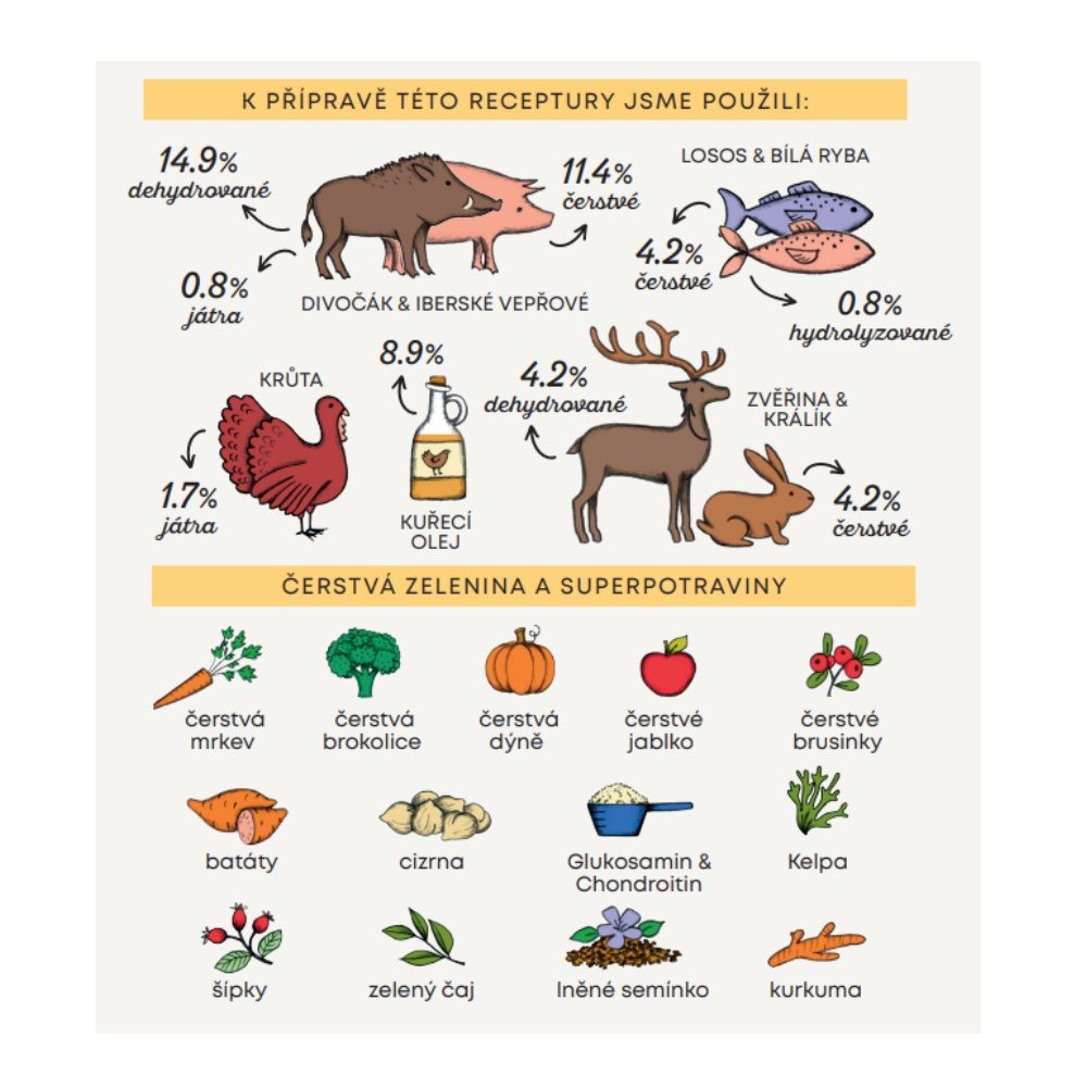 Složení: dehydrované iberské vepřové 14,9 %, dehydrované brambory, kuřecí olej (chráněno přírodními tokoferoly) 8,9 %, celý zelený hrášek, čerstvé vykostěné vepřové 7,2 %, bramborový škrob, dehydrovaná zvěřina 4,2 %, čerstvý losos 4,2 %, čerstvý vykostěný králík 4,2 %, čerstvý vykostěný divočák 4,2 %, celá cizrna 4,2 %, celý žlutý hrášek 4 %, jablečná vláknina, dehydrované sladké brambory 2,1 %, minerální látky, hydrolyzát z krůty 1,7 %, hydrolyzát z vepřových jater 0,8 %, hydrolyzát z ryb 0,8 %, lněné semínko (přírodní zdroj mastných kyselin ω3) 0,6 %, řepné řízky, kvasnice (Saccharomyces cerevisiae), čerstvá brokolice 1000 mg/kg, čerstvá dýně 1000 mg/kg, čerstvá jablka 1000 mg/kg, čerstvá mrkev 1000 mg/kg, glukosamin 1000 mg/kg, chondroitin 600 mg/kg, hydrolyzovaná buněčná stěna kvasnic (zdroj MOS) 500 mg/kg, čekanka (zdroj FOS) 500 mg/kg, výtažek z mandarinky 400 mg/kg, Yucca schidigera 200 mg/kg, řasa Kelpa 30 mg/kg, klikva celé plody 30 mg/kg, šípky (bohaté na vitamín C) 30 mg/kg, zelený čaj 30 mg/kg, kurkuma 30 mg/kg.