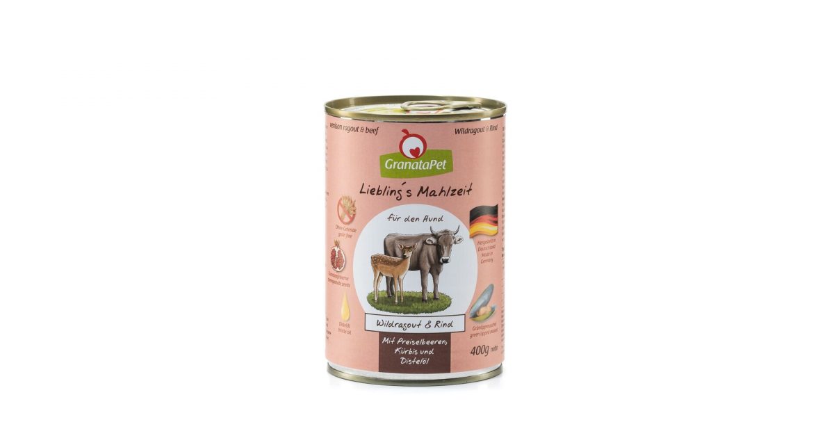 Konzerva GranataPet divočinové ragú a hovězí s brusinkami, dýní a bodlákovým olejem pro pevné zdraví
