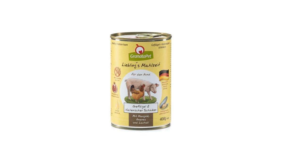 Konzerva GranataPet kuře a italská šunka s mangoldem, ananasem a lososovým olejem pro ocelově pevné zdraví