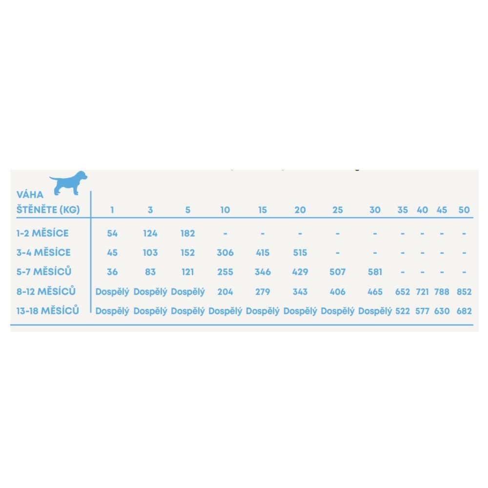 Krmný návod: změnu krmiva je třeba provádět postupně po dobu 7 dní. Po odstavení krmte 4 x až 5 x za den. Do 4 měsíců věku smícháním s teplou vodou v poměru 1 díl vody a 3 díly krmiva. Odstraňte zbytky krmiva. Štěněti okolo 1 roku postupně snižujte počet krmných dávek až na 2 za den. Pes musí mít vždy přístup k čisté, čerstvé vodě. Skladování: skladujte na chladném a suchém místě. Obal by měl být po použití vždy bezpečně uzavřen.