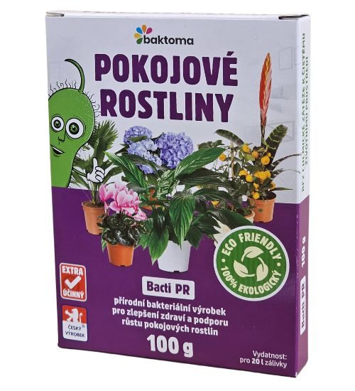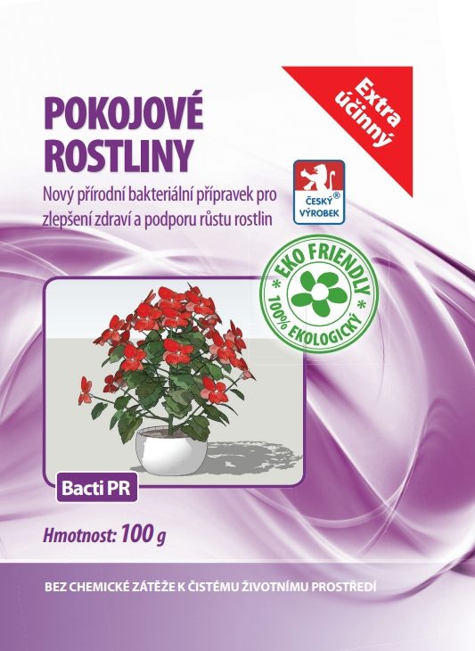 Přípravek Bacti PR je směs půdních bakterií kombinovaná s vybranou mikrovýživou pro podporu růstu a posílení zdraví pokojových rostlin. Bakterie obsažené v Bacti PR činí půdní minerály snadno rozpustnými a přístupnějšími pro využití rostlinami. Vytlačují patogeny, rostlinu živí a podporují její zdravý růst. Pro rostlinu se stane dostupnějším zejména fosfor, draslík a železo. Výrazně stimuluje přirozenou odolnost proti listovým chorobám (padlí, plísně, houby…), zesílí kořeny i celá nadzemní část.