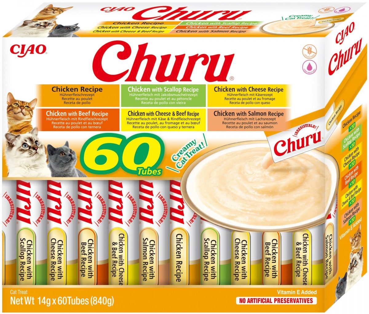 Balení obsahuje celkem 60 pamlsků: 10x kuřecí, 10x kuřecí se sýrem, 10x kuřecí s hovězím, 10x kuřecí se sýrem a hovězím, 10x kuřecí s hřebenatkou a 10x kuřecí s lososem. Zdravé mlsání s nízkým obsahem kalorií, bez konzervantů, chemických aromat, bez barviv a umělých dochucovadel. Inovativní měkká konzistence pamlsku Churu vám umožní trávit společné chvíle s vaší kočičkou hravým a interaktivním způsobem.