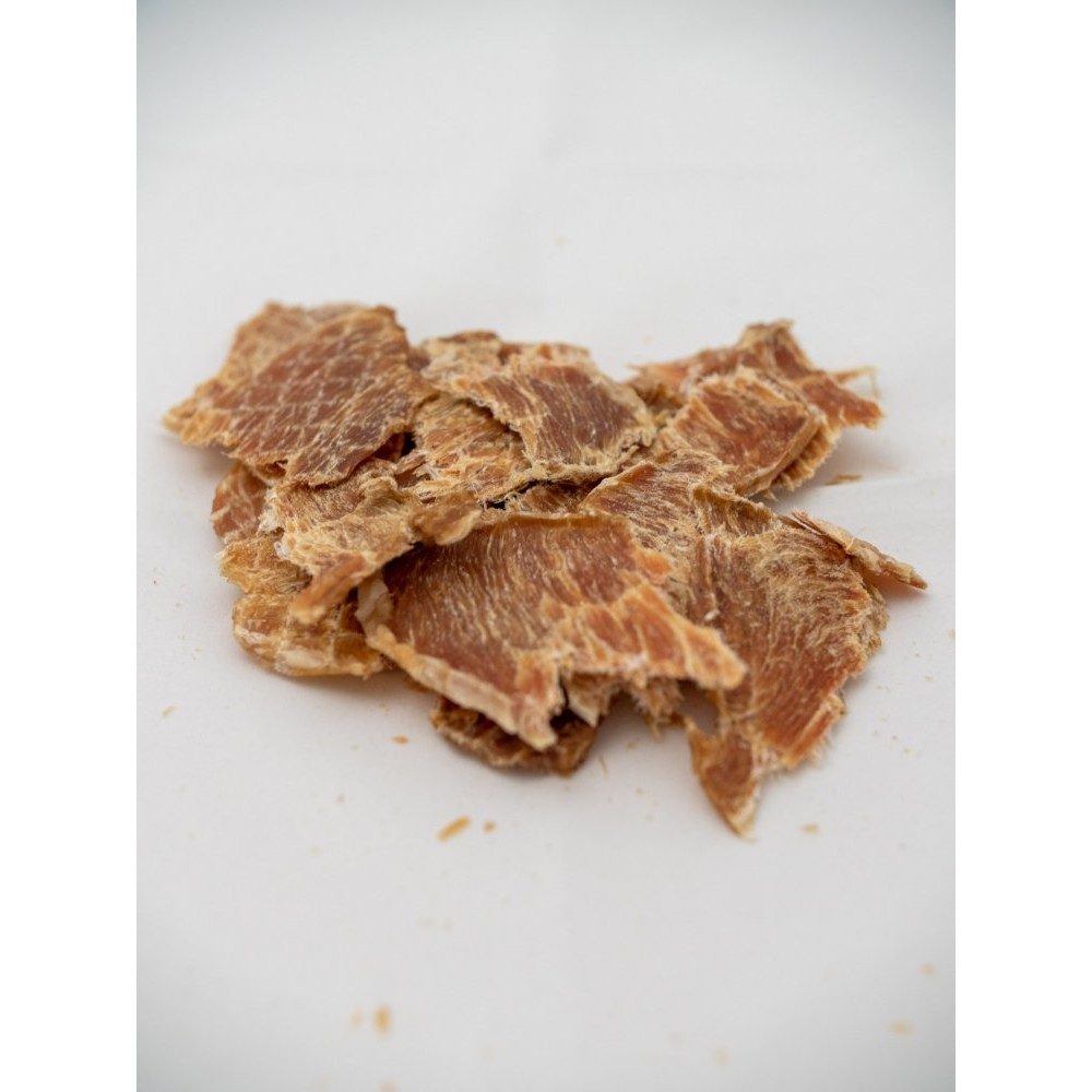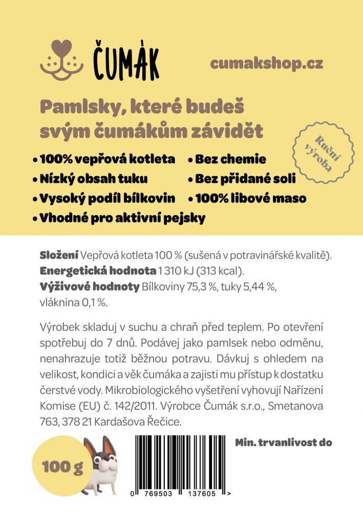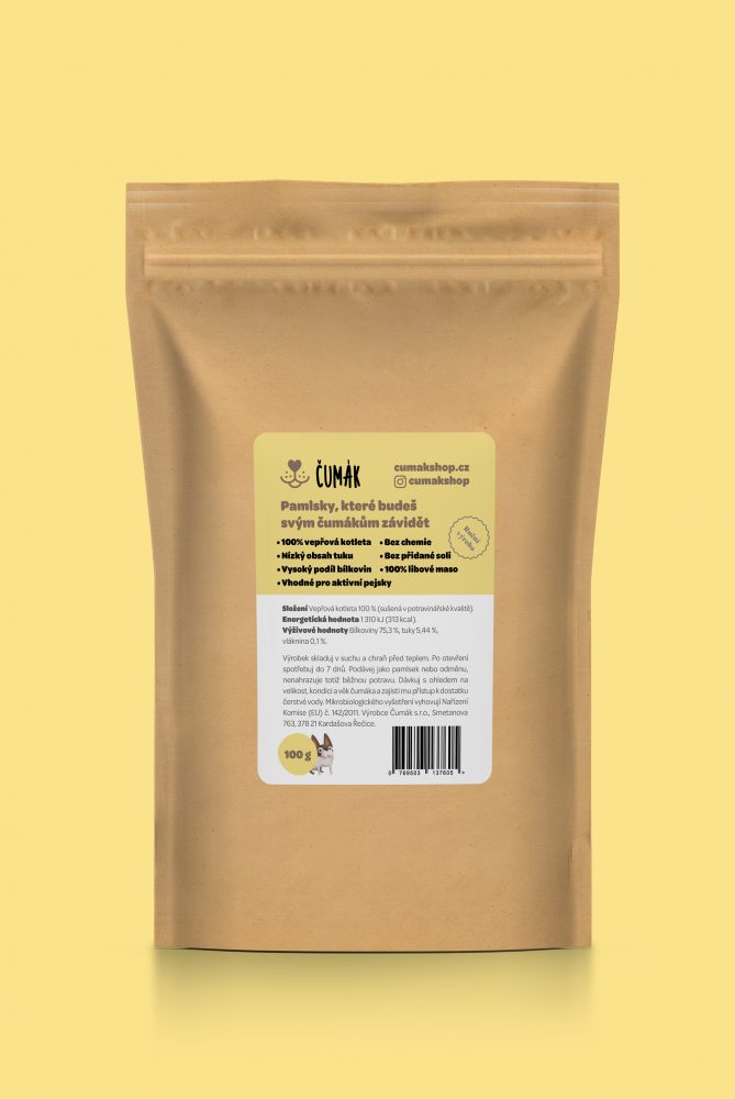 100 gramů usušené vepřové kotletky už je pořádná porce na to, abyste svého aktivního čumáka, pro nějž je tenhle pamlsek nejvhodnější, po zásluze odměnili, nacvičili nový povel, anebo mu „jen” po večerech projevovali svou lásku. Jak velké sousto k tomu zvolíte, je jen vás.