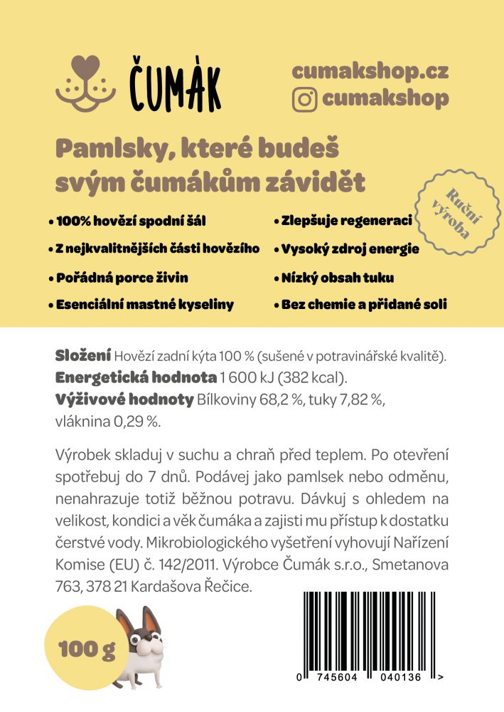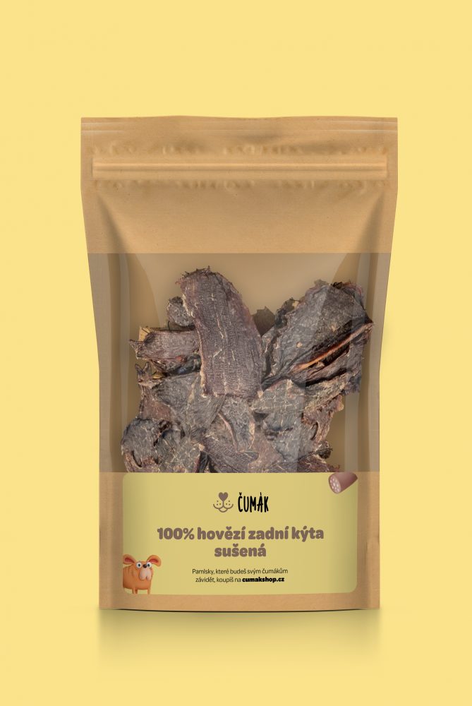 100 gramů usušené hovězí kýty se může zdát jako nemalá sváča. Až ale vašemu čumákovi zachutná, a věřte tomu, že mu bude po chuti, bude pryč, než řeknete „raf“. Obsahuje spoustu bílkovin, železa, vitamínů (zejména B, D, E), hořčíku, draslíku, vápníku a zinku. Není téměř tučné a slouží jako velký zdroj energie. Vysoký obsah kreatinu zajišťuje rychlou regeneraci a celkové zpevnění a osvalení vašeho chlupáče, esenciální mastné kyseliny zase pečují o zdravé klouby, svaly a lesklou srst. Notovižejo, hezky papej.