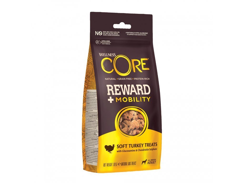 Reward + Mobility s krutí příchutí jsou pamlsky s recepturou na bázi krůtího masa obsahující zaručené množství glukosaminu a chondroitin sulfátu podporující optimální zdraví kyčlí a kloubů. Vyrobeno s ohledem na všechny zásady výživy Wellness Core, aby vznikl zcela přírodní pamlsek bez obilovin. Malé, měkké pamlsky, ideální pro zábavné mlsání bez pocitu viny a pro chvíle sbližování s vaším chlupatým přítelem.