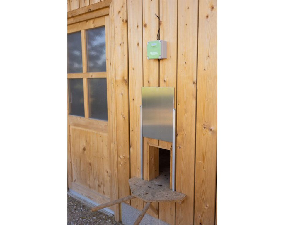 Dvířka k automatickému systému KERBL pro otevírání a zavírání kurníku. Větší velikosti vhodné i pro velká plemena slepic, pro kachny a další drůbež.