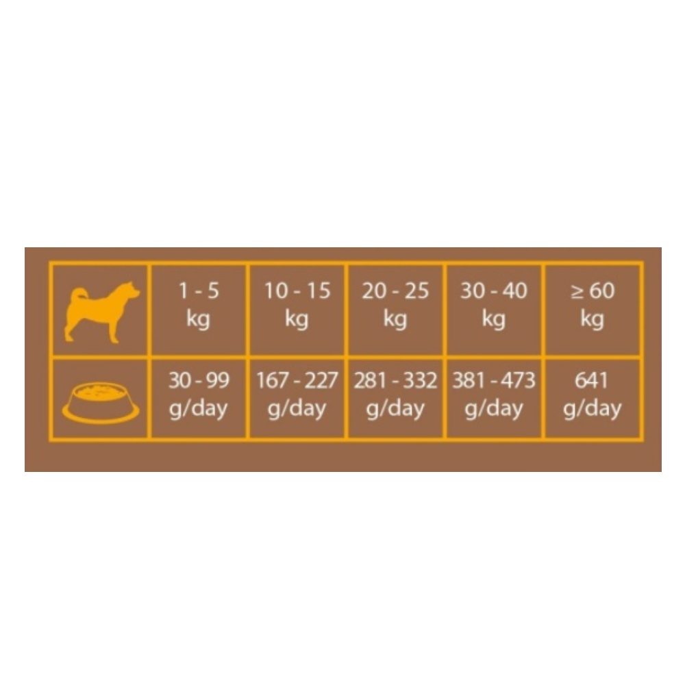 Složení: Obiloviny (rýže 5 %), maso a vedlejší produkty živočišného původu (čerstvé drůbeží maso 10 %, drůbeží maso 10 %), oleje a tuky ( drůbeží tuk), produkty rostlinného původu, ryby a vedlejší rybí produkty, minerální látky, ovoce (jablko 1,000 mg/kg a borůvky 1,000 mg/kg), kvasnice (500 mg/kg).
