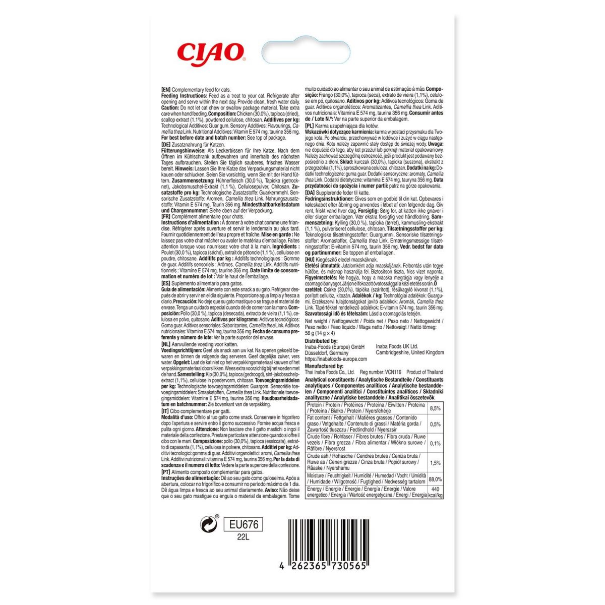 Každý produkt Inaba je vyroben z lahodných vysoce kvalitních surovin, včetně kuřete chovaného na farmě nebo přírodního tuňáka uloveného ve volné přírodě. První svého druhu krémová pochoutka navržená tak, aby napomáhala kontrole chlupů. Naše originální složení Churu s přidanou nerozpustnou rostlinnou vlákninou pro podporu zdravého trávení a kontrolu chlupů. Hydratace je důležitá, takže pochoutky Churu Hairball Control Treats mají 88% vlhkosti. Váš kočičí přítel je pro nás důležitý, takže jsme z našich kočičích pamlsků vynechali věci jako obilí, konzervační látky, umělá barviva a karagenan, ale přidali jsme věci jako vitamín E pro imunitu a taurin pro celkové zdraví.