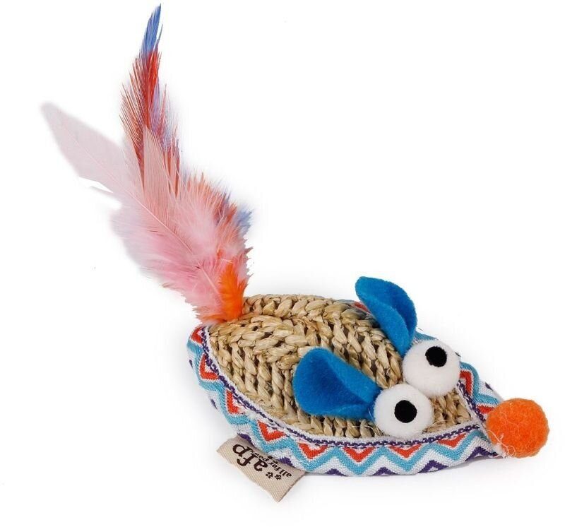 Pestrobarevná hračka ve tvaru myšky z umělého lýka s peříčky plněná šantou.