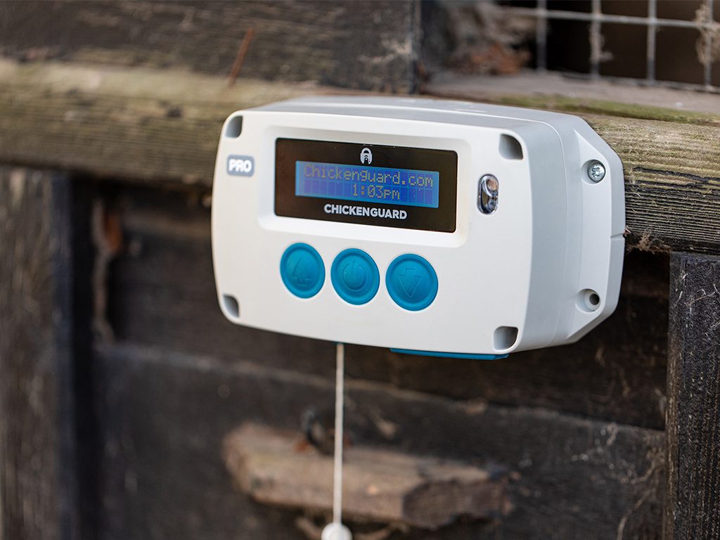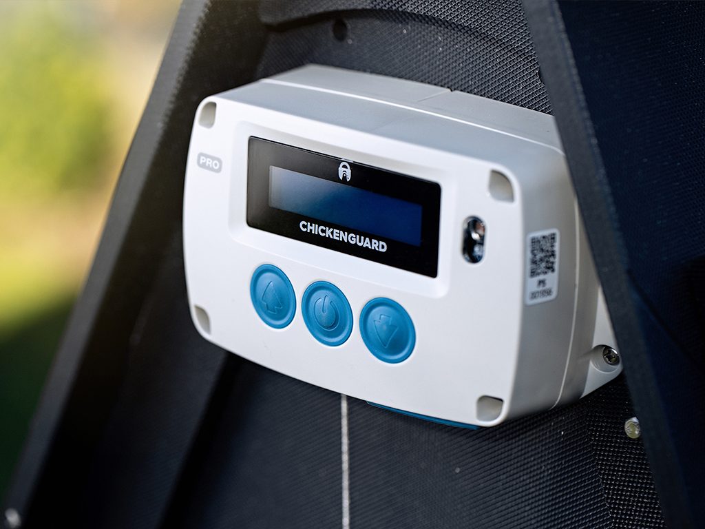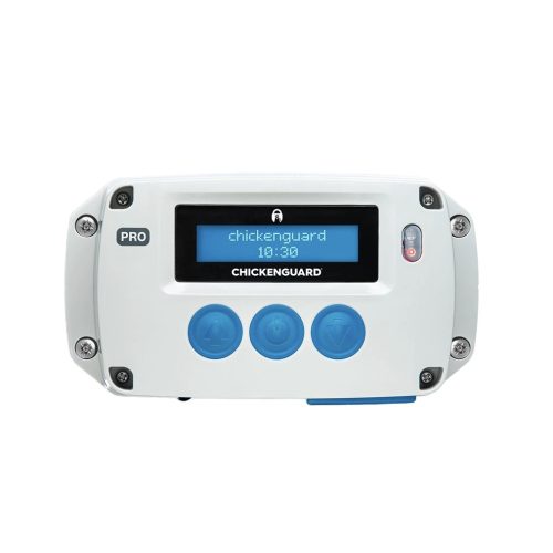 Chicken Guard Pro má velice výkonný motor, který dokáže zvednout až 2 kg, takže je ideální pro otevírání větších a těžších dvířek. Součástí zařízení je také bezkontaktní snímač polohy dvířek. Přístroj je vybaven velice odolným pouzdrem, a tak zajišťuje perfektní ochranu při extrémních povětrnostních podmínkách až do teploty -20°C. Všechny potřebné informace o nastavení jsou přehledně znázorněny na dvouřádkovém LCD displeji. LCD displej přejde po určité době nečinnosti do "režimu spánku", aby se zvýšila životnost displeje. Zařízení znovu "probudíte" stisknutím tlačítka MENU. Pro nastavování programů slouží extra velká tlačítka, aby bylo možné je ovládat i v rukavicích.