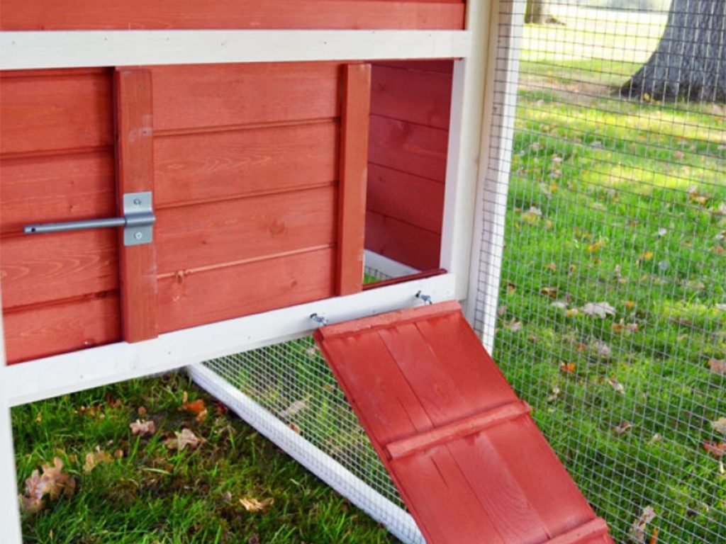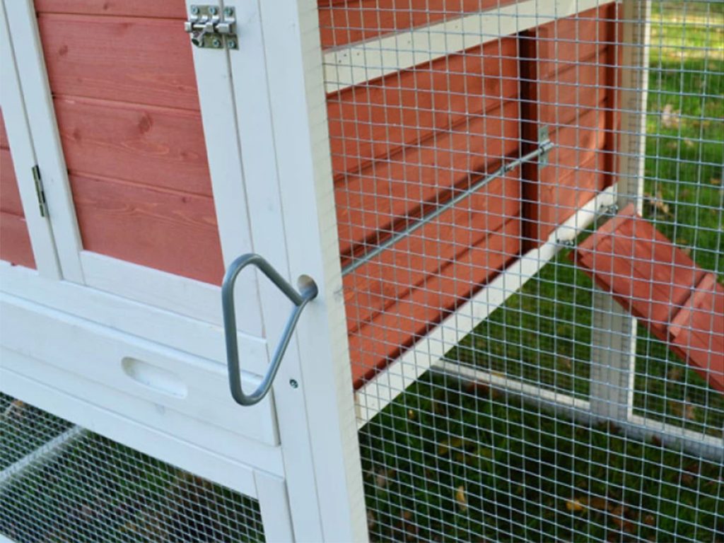 Pro snadný přístup je kurník vybaven hned dvěma dvířky. Jedny dvířka jsou umístěna z přední strany kurníku, druhá z boční strany, která se uzavírají pomocí skvělého systému venkovního madla, a proto nebudete muset vcházet do výběhu otevřít a zavřít slepice v kurníku. Samotný výběh je vybaven dvěma dvířky, velké pro Váš snadný přístup pro výměnu krmení a vody a druhá malá boční sklápěcí, která slouží na vypuštění slepic z výběhu.