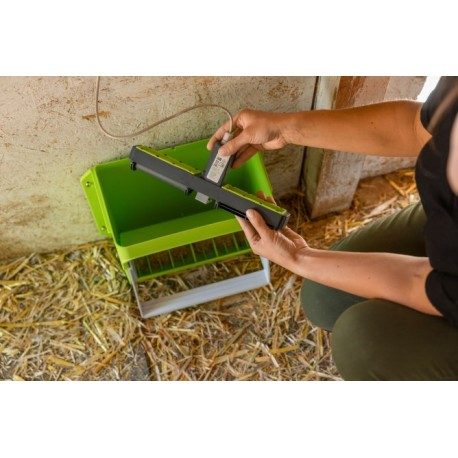 Dávkovač krmiva pro automatické nášlapné krmítko pro drůbež SmartCoop. Automatický dávkovač krmiva slouží k regulaci krmné dávky, nastavení času krmení a kontroly naplnění. Čas a množství krmiva lze individuálně nastavit dle potřeby. Senzor detekuje nízkou hladinu krmiva a předává signál do řídící jednotky.