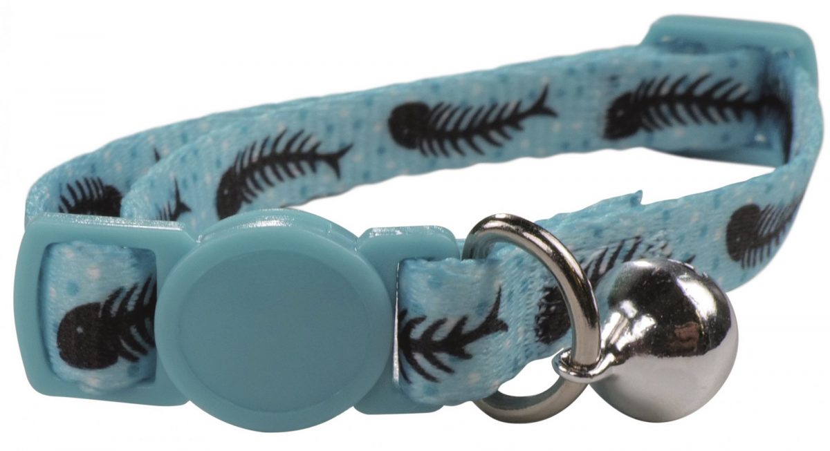 Moderní designový obojek určený pro kočky. Obojek obsahuje rolničku a po jeho obvodu jsou malé ryby.