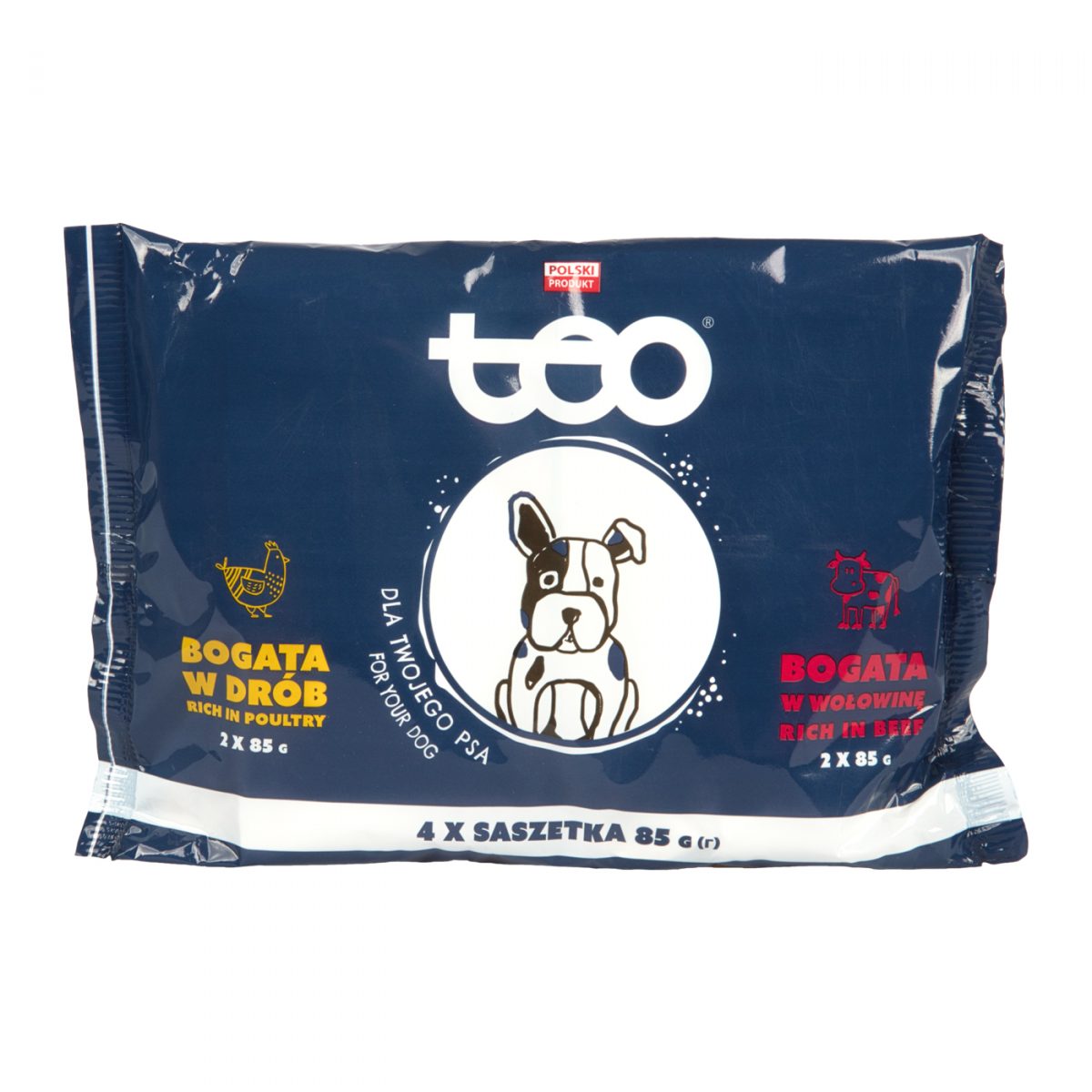 Kapsička pro psy pro všechna plemena s normální aktivitou, drůbeží a hovězí příchuť, čerstvé maso v sušině 6.5%, tuky 4%
