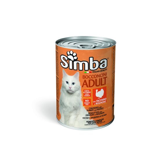 Simba Cat kousky s krůtou a ledvinkami je kompletní krmivo pro dospělé kočky. Kousky v omáčce připravené z kvalitních ingrediencí, jako je krůtí maso a ledviny, zdroj bílkovin a minerálů, se pečou v troubě, aby zvýraznily jejich přirozenou chuť a stimulovaly každodenní chuť k jídlu vašeho mazlíčka. Složení bylo vyvinuto se specifickou kombinací vitamínů A-D3-E, aby splnilo nutriční požadavky denní potřeby vašeho mazlíčka. Bez přidaných barviv a konzervačních látek.