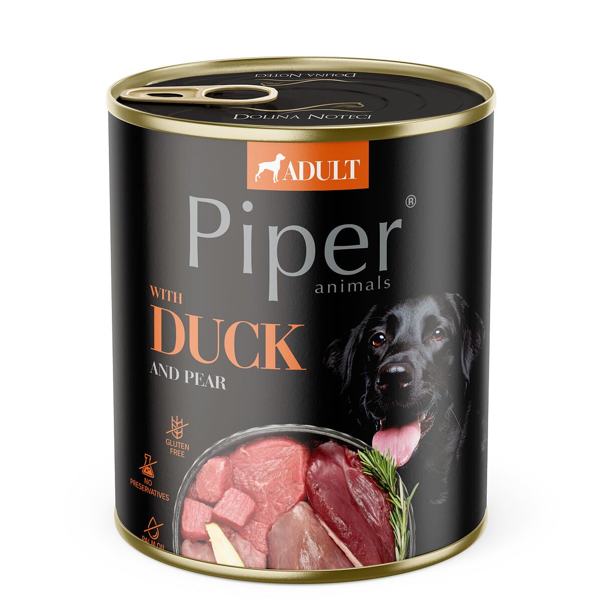 maso a produkty živočišného původu 65 % (z toho 10 % hovězí, 10 % vepřové, 10 % kachní filet, 3% kuřecí žaludky, 3 % vepřové srdce), vývar, ovoce (hruška 4%), obiloviny ( přírodní hnědá rýže 4%), minerální látky, oleje a tuky (lněný olej 0,2 %), sušený rozmarýn 0,01 %