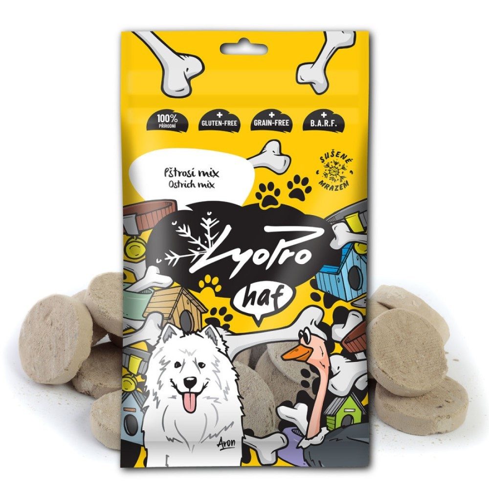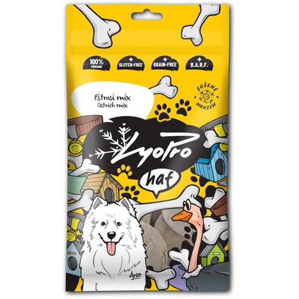 Pštrosí mix je skutečnou delikatesou pro psí gurmány. Lahodná kombinace masa, vnitřností a žloutků vynese vašeho psího parťáka až do nebe. Pštrosí mix dokáže překvapit jak neodolatelnou vůní, tak intenzivní a neobyčejnou chutí. Zdravá kombinace masa, vnitřností a žloutků dodá vašemu chlupatému příteli pořádnou dávku bílkovin, vitamínů, minerálů a dalších živin. Díky šetrnému sušení mrazem si ingredience zachovají maximum živin. Potěší vás také přírodní složení bez konzervantů, barviv, obilí a dalších balastních látek.