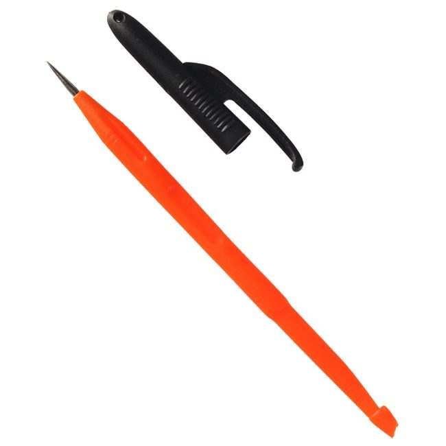 Praktický vyprošťovač háčků, který je z druhé strany zakončen ocelovým hrotem. Krycí čepička je osazena klipem a očkem, s možností zavěšení vyprošťovače na krk.