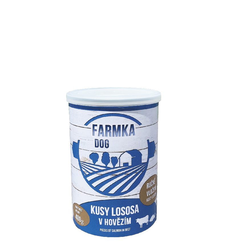 Ručně a poctivě vkládané kusy lososa v hovězím pro psy.