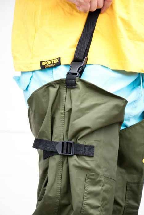 Holínky do rozkroku na brodění mají tlustou podrážku a pevnou gumovou botu která zabezpečuje dokonalou stabilitu i na kluzkém terénu.