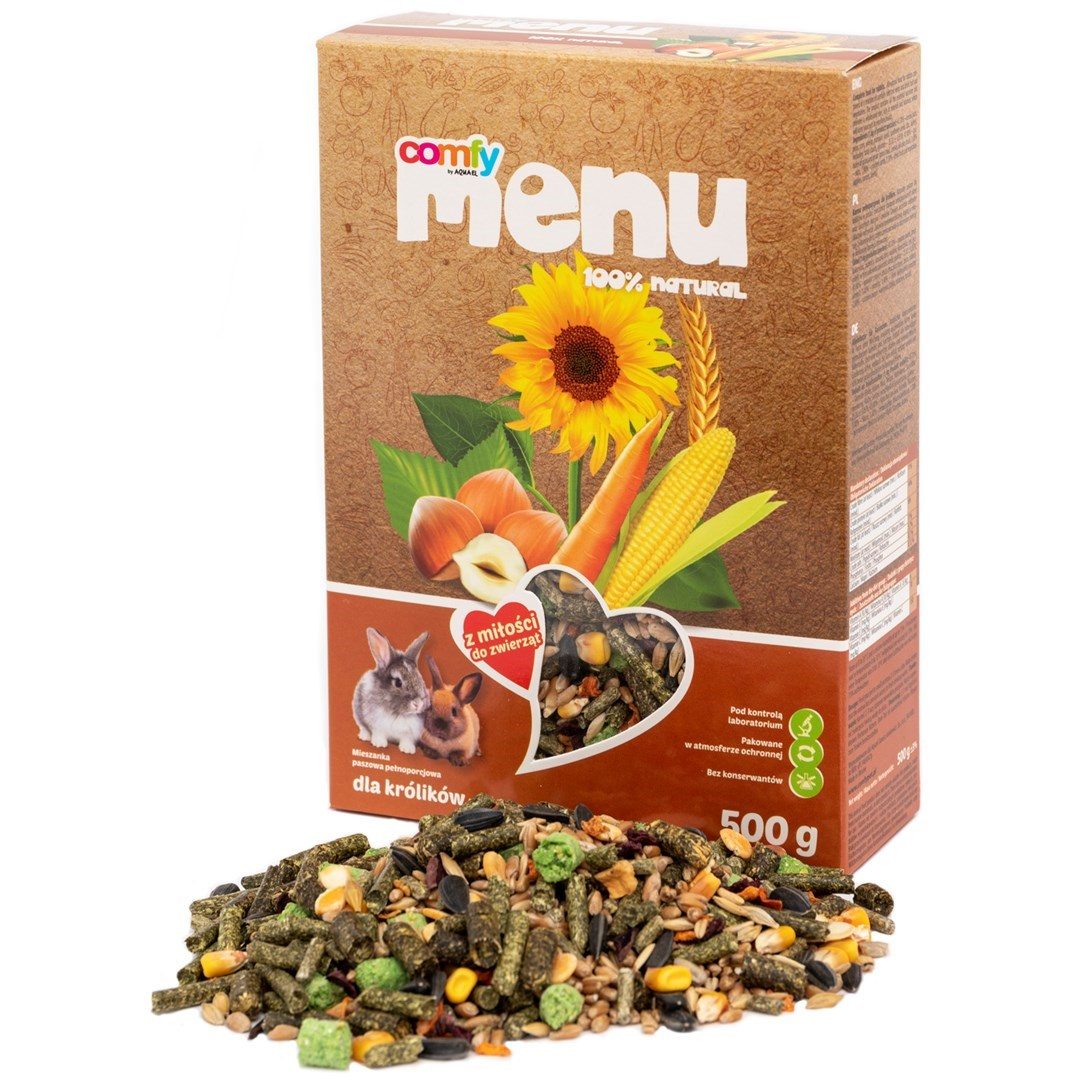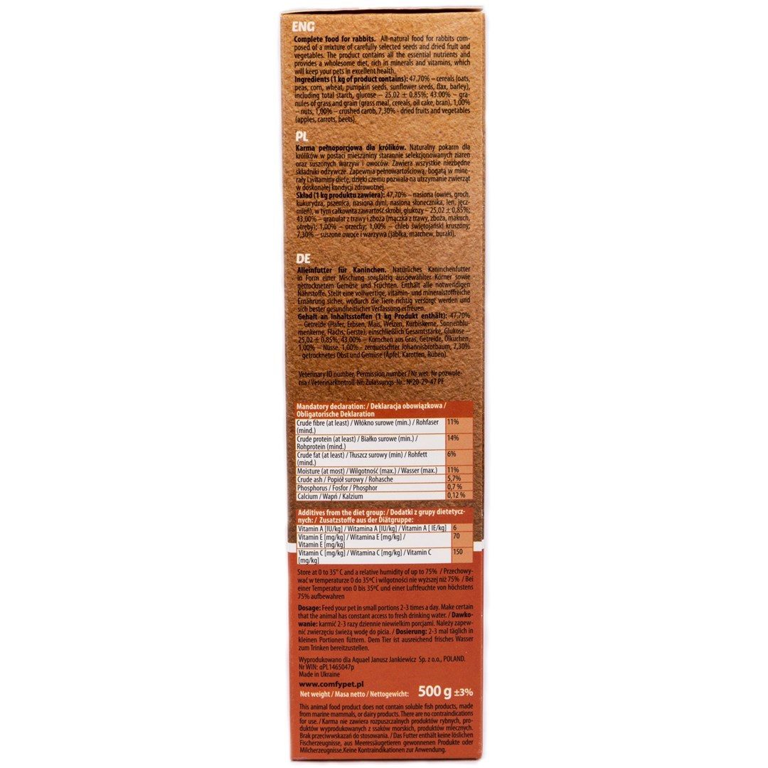 Kompletní krmivo pro králíky. Přírodní krmivo pro králíky ve formě směsi pečlivě vybraných obilovin a sušeného ovoce a zeleniny. Obsahuje všechny základní živiny. Poskytuje plnohodnotnou stravu bohatou na minerály a vitamíny, která udržuje zvířata ve výborném zdravotním stavu. Karob je zdrojem lehce stravitelných sacharidů, vitamínů A, B1, B2, E, minerálních solí a vlákniny. Má příznivý vliv na trávicí systém a léčí gastrointestinální poruchy. Obsahuje vápník a fosfor, které posilují kosterní systém, a kyselinu gallovou, která má antibakteriální a antivirový účinek. Plody chrání imunitní systém, prospívají střevnímu traktu, zabraňují zácpě a jsou bohaté na vitaminy, železo, vápník a vlákninu. Mají vyživující a posilující vlastnosti. Přídavek lnu má zklidňující účinek na tísnivé příznaky trávicího traktu a také snižuje hladinu cholesterolu v krvi. Mrkev má vysoký obsah beta-karotenu neboli provitaminu A, který je nezbytný pro zrak. Červená řepa podporuje oběhový systém tím, že zvyšuje příjem kyslíku buňkami.