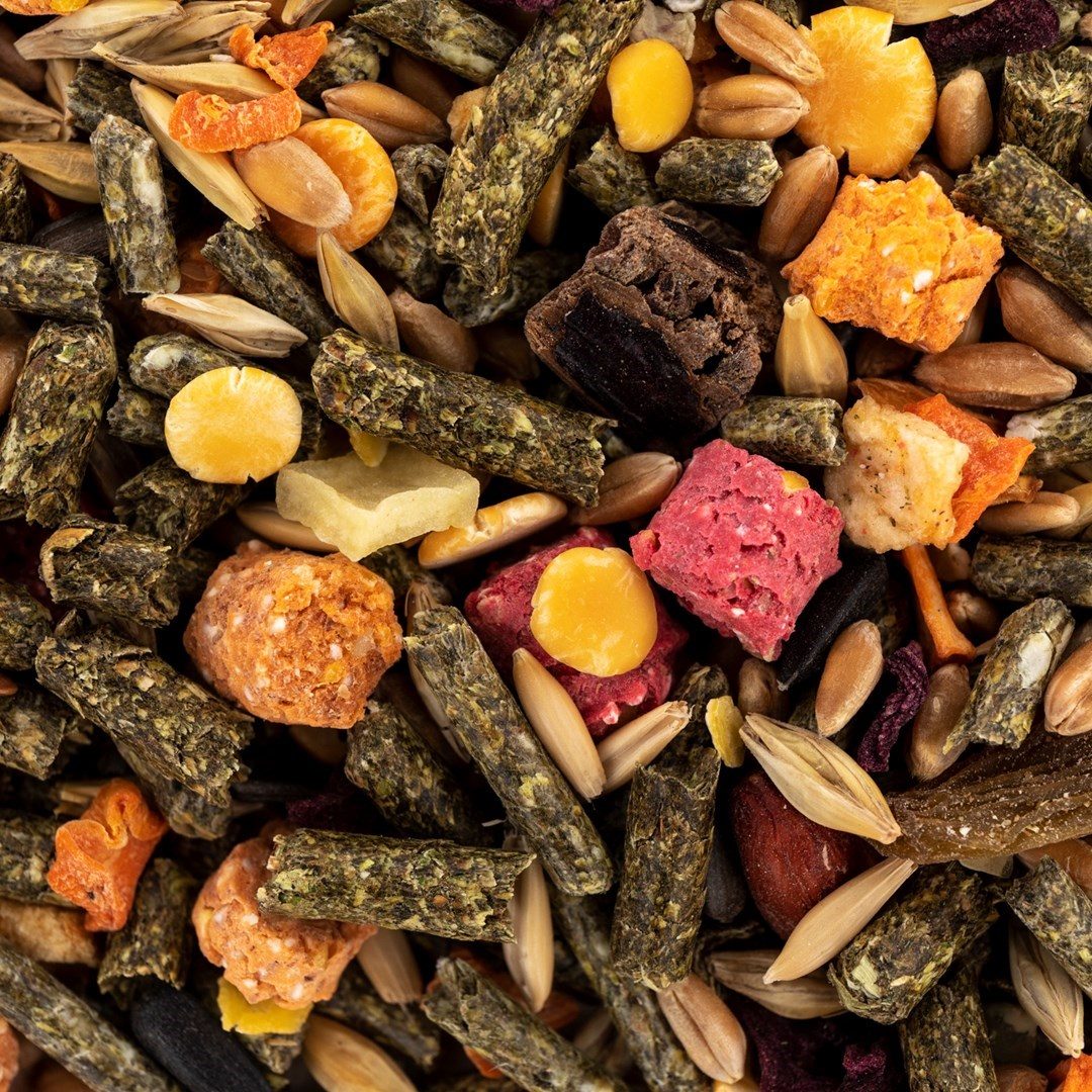 Kompletní krmivo - kompletní krmivo pro potkany. Přírodní krmivo pro králíky ve formě směsi pečlivě vybraných obilovin a sušeného ovoce a zeleniny.