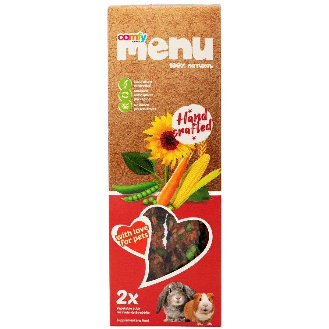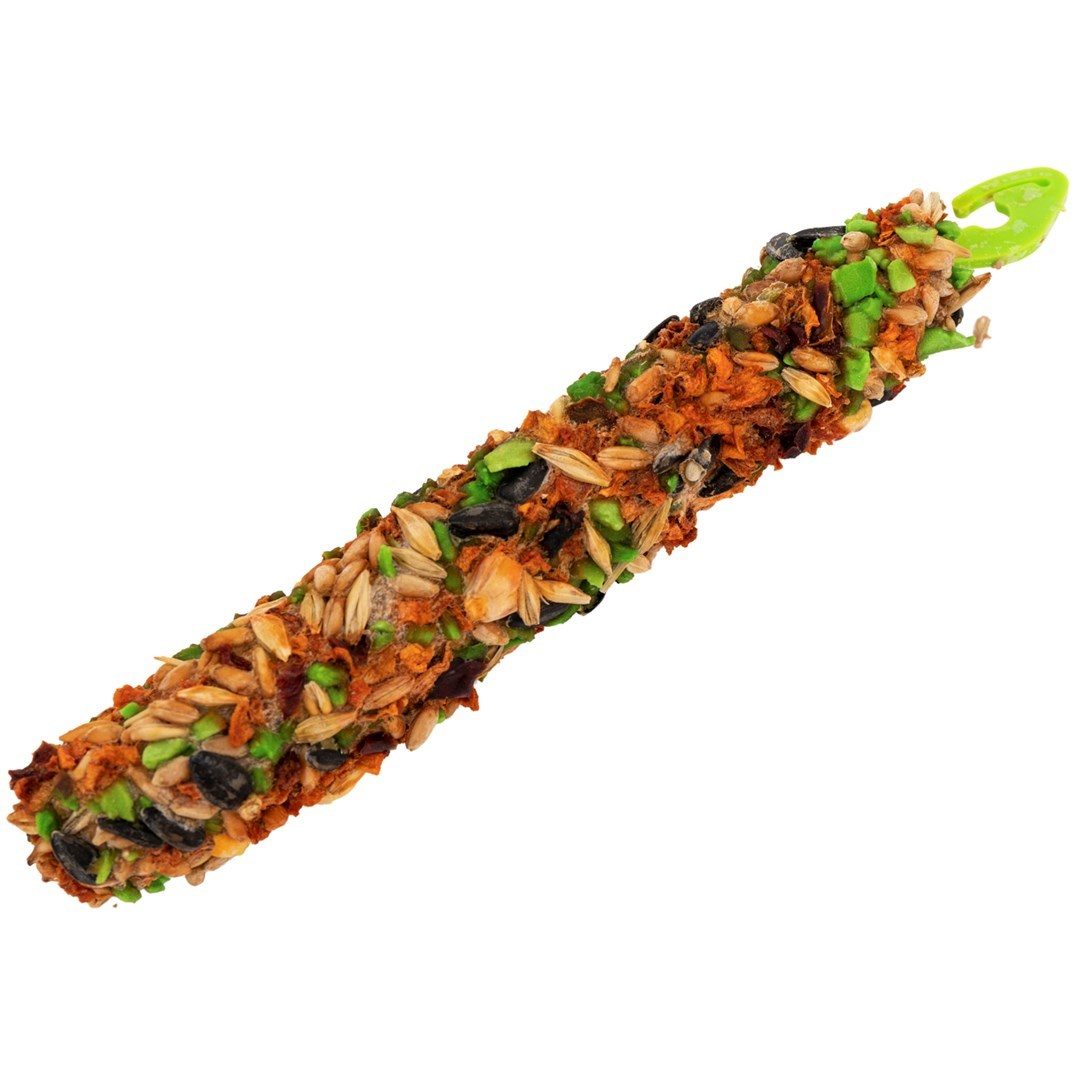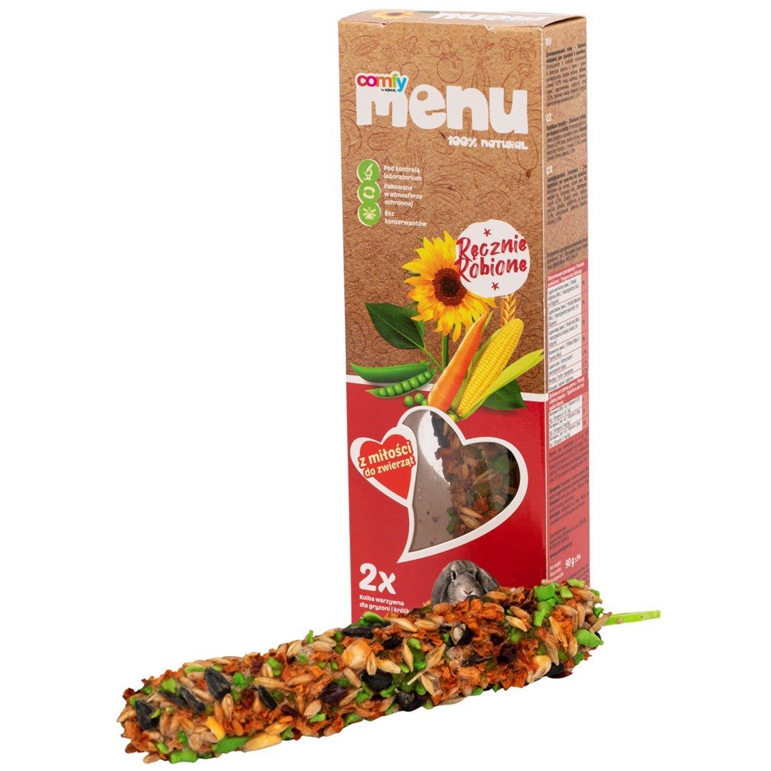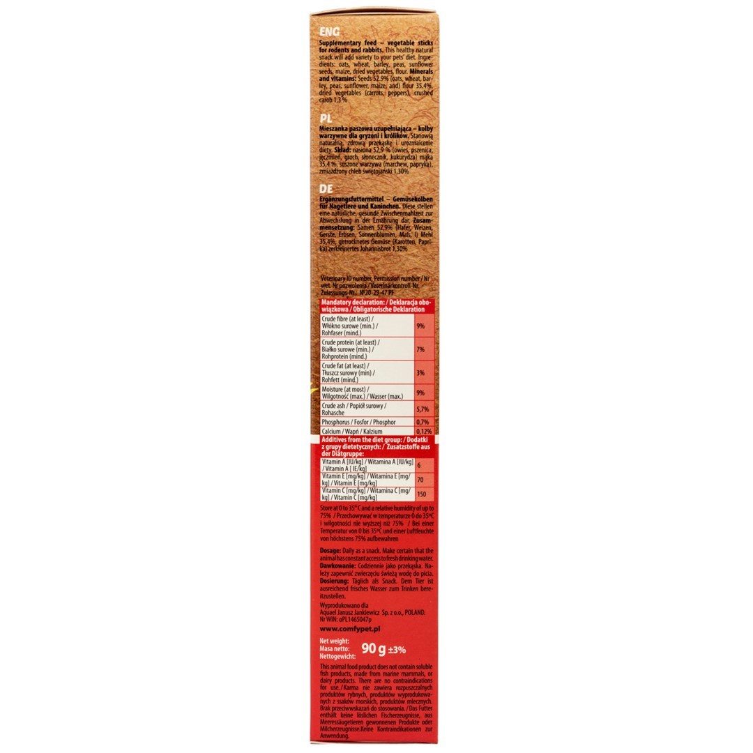 Doplňkové krmivo - zeleninové baňky pro hlodavce a králíky. Poskytují přirozenou, zdravou svačinu a zpestřují stravu. Baňky obsahují semena, jako je oves, pšenice, ječmen, hrách, a také slunečnici, kukuřici, drcený rohovník a sušenou zeleninu. Jsou vyrobeny pouze z přírodních surovin, bez zlepšujících látek a konzervačních látek, a jsou tak zárukou zdraví pro vaše zvíře. Koláč obsahuje přirozeně se vyskytující vitamíny a minerální látky. Karob je zdrojem lehce stravitelných sacharidů, vitamínů A, B1, B2, E, minerálních solí a vlákniny. Má příznivý vliv na trávicí systém a léčí gastrointestinální poruchy. Obsahuje vápník a fosfor, které posilují kosterní systém, a kyselinu gallovou, která má antibakteriální a antivirový účinek. Zelenina chrání imunitní systém, prospívá střevnímu traktu, zabraňuje zácpě a je bohatá na vitaminy, železo, vápník a vlákninu. Mrkev obsažená v klasu je bohatým zdrojem karotenu - provitaminu pro vitamin A, nezbytný pro zrak.