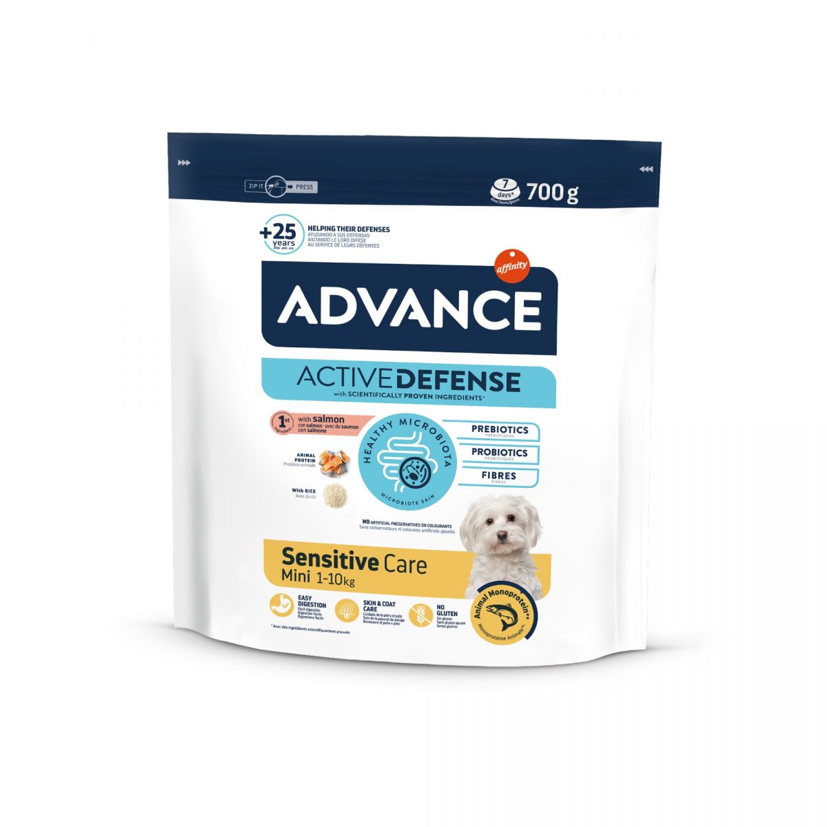 Krmivo Advance Adult Mini Sensitive Care je speciálně určeno k podpoře trávení malých psů. Vyrobeno z lososa jako jediného zdroje živočišných bílkovin a s rýží.