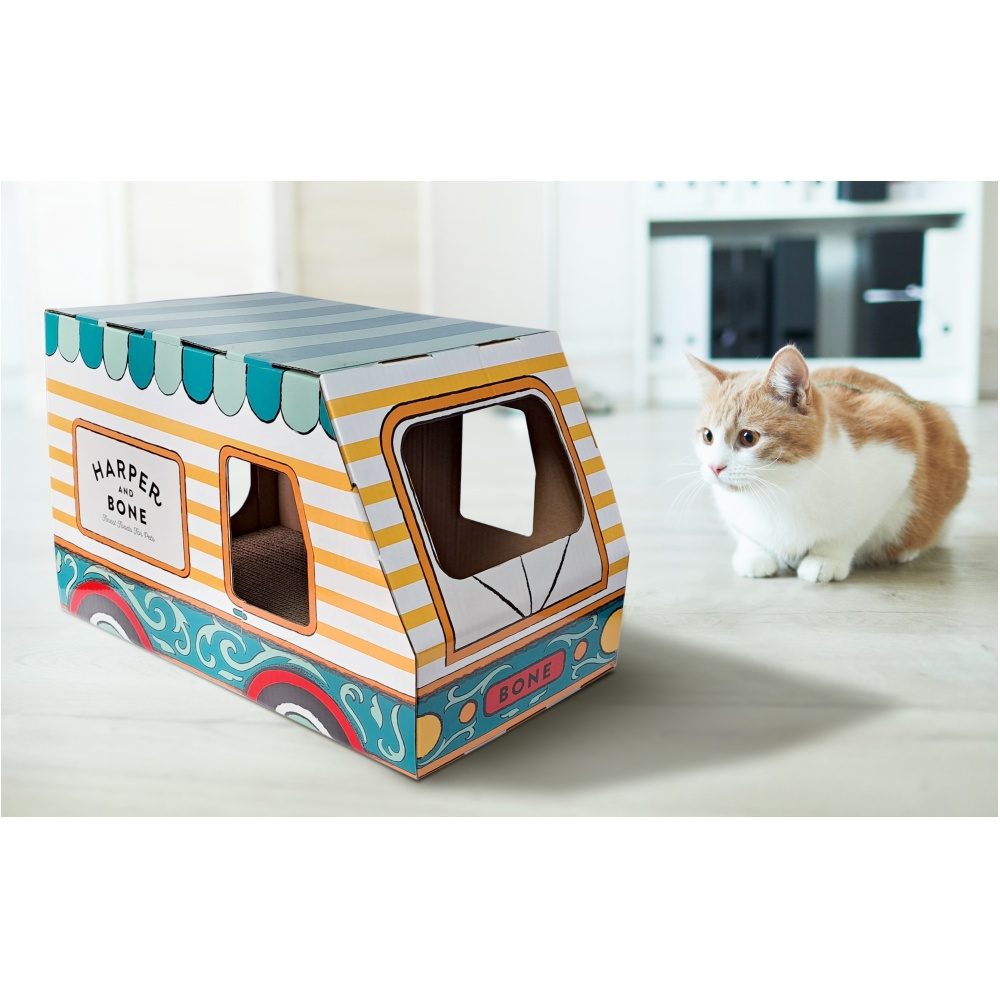 Kartonový domeček pro kočky ve tvaru auta Harper & Bone. Uvnitř se škrábadlem pro hodiny zábavy vaší kočky.