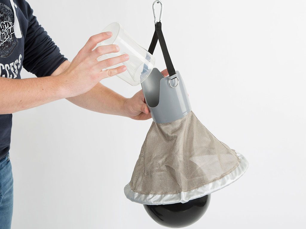 Závěsný lapač ovádů, pro plochy do 100 m2, zavěšení ve výšce od 100 cm do 180 cm, do ohrad, stájí, zahrad, výběhů, kempů, hřišť a parků, šetrné k životnímu prostředí, průměr cca 35 cm, hmotnost cca 1,545 g.