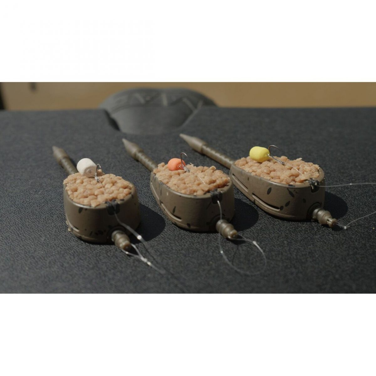Integrovaná spona vám umožňuje nastavit délku vlasce s háčkem a směr hrotu háčku a snadno se uvolní ze sevření, když je ryba chycena. Každé krmítko je plněno zepředu, aby byla zajištěna maximální vzdálenost a přesnost náhozu, a je vybaveno chytře navrženou šikmou základnou, která vytváří menší výtlak vody, když krmítko dosedne na hladinu vody. Tato nakloněná základna nejen chrání návnadu v krmítku před uvolněním a vypadnutím při dopadu při nahazování, ale také vytváří méně hluku při dopadu, což vytváří nerušivý zvuk při vstupu do vody. Dalším chytrým designem jsou spodní otvory na krmítku, protože nejsou pouze zúžené, aby zajistily pomalejší uvolňování návnady, ale jsou natočeny v opačném směru, než je směr, ve kterém krmítko dopadá, čímž opět chrání návnadu uvnitř při vstupu do vody. Každé krmítko má také vyměnitelný design, takže krmítka lze rychle měnit, aniž by bylo nutné návazec rozebírat.