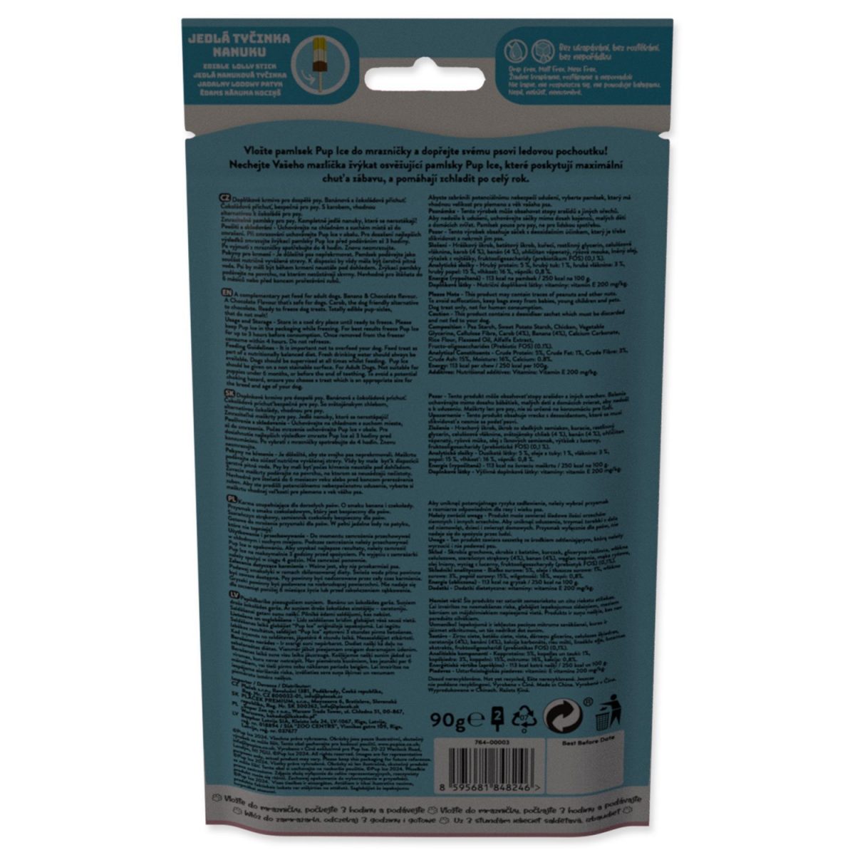 Nenechte svého pejska trpět horkem! Dopřejte mu radost a osvěžení s chladícím pamlskem pro psy. Objednejte ještě dnes a udělejte z každého letního dne nezapomenutelný zážitek pro vašeho čtyřnohého kamaráda! Složení Hrachový škrob, batátový škrob, kuřecí, rostlinný glycerin, celulózová vláknina, karob (4 %), banán (4 %), uhličitan vápenatý, rýžová mouka, lněný olej, výtažek z vojtěšky, fruktooligosacharidy (prebiotikum FOS) (0,1 %). Analytické složky Hrubý protein: 5 %, hrubý tuk: 1 %, hrubá vláknina: 3 %, hrubý popel: 15 %, vlhkost: 16 %, vápník: 0,8 %. Energie (vypočtená) - 113 kcal na pamlsek / 250 kcal na 100 g. Upozornění Výrobek může obsahovat stopy arašídů a jiných ořechů.Uchovávejte sáčky mimo dosah kojenců, malých dětí a domácích zvířat. Pamlsek pouze pro psy. Výrobek obsahuje sáček s deoxidačním účinkem, který není určen ke konzumaci. Pokyny pro krmení Pamlsek podávejte jako součást nutričně vyvážené stravy. K dispozici by vždy měla být čerstvá pitná voda. Psi by měli být během krmení neustále pod dohledem. Žvýkací pamlsky podávejte na povrchu, na kterém nezůstávají skvrny. Nevhodné pro štěňata do 6 měsíců nebo před koncem prořezávání zubů. Abyste zabránili potenciálnímu nebezpečí udušení, vyberte pamlsek, který má vhodnou velikost pro plemeno a věk vašeho psa.