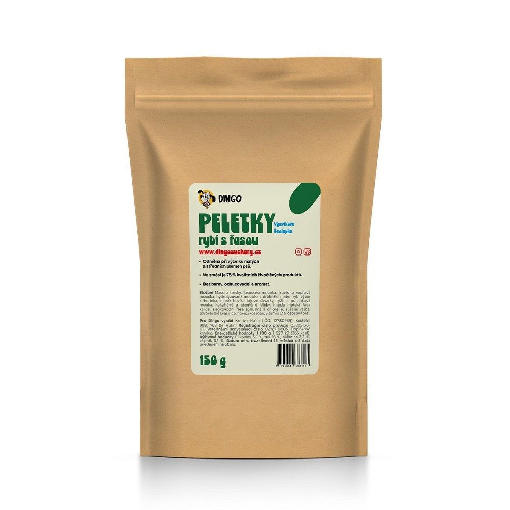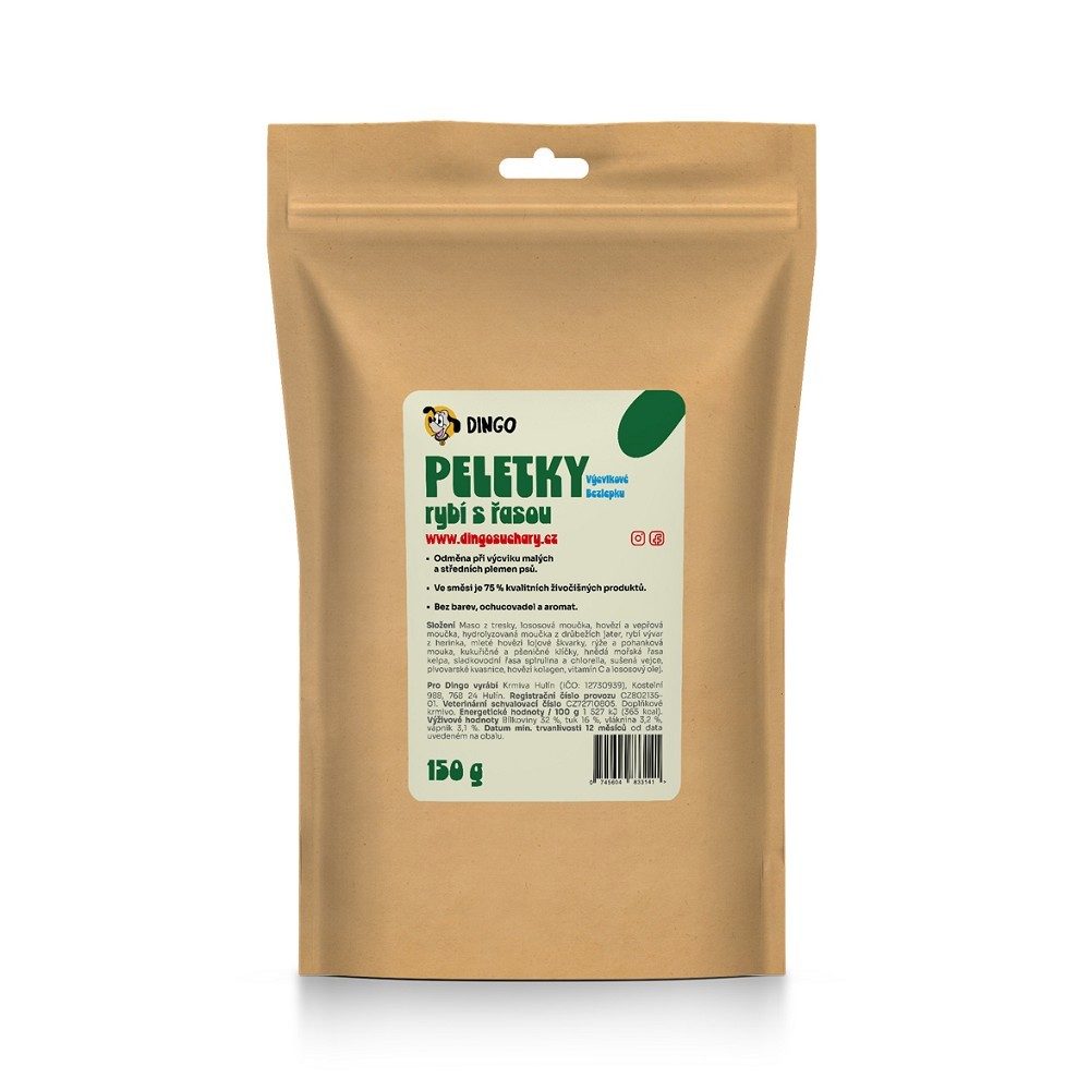 Charakteristika: Výcvikový pamlsek vyrábíme ve tvaru drobných peletek o průměru 6 mm a délce cca 4 - 6 mm. Jde o vařený produkt z převládající rybí a masové směsi s menším, pouze pro soudržnost nutným rostlinným podílem, který neobsahuje lepek.