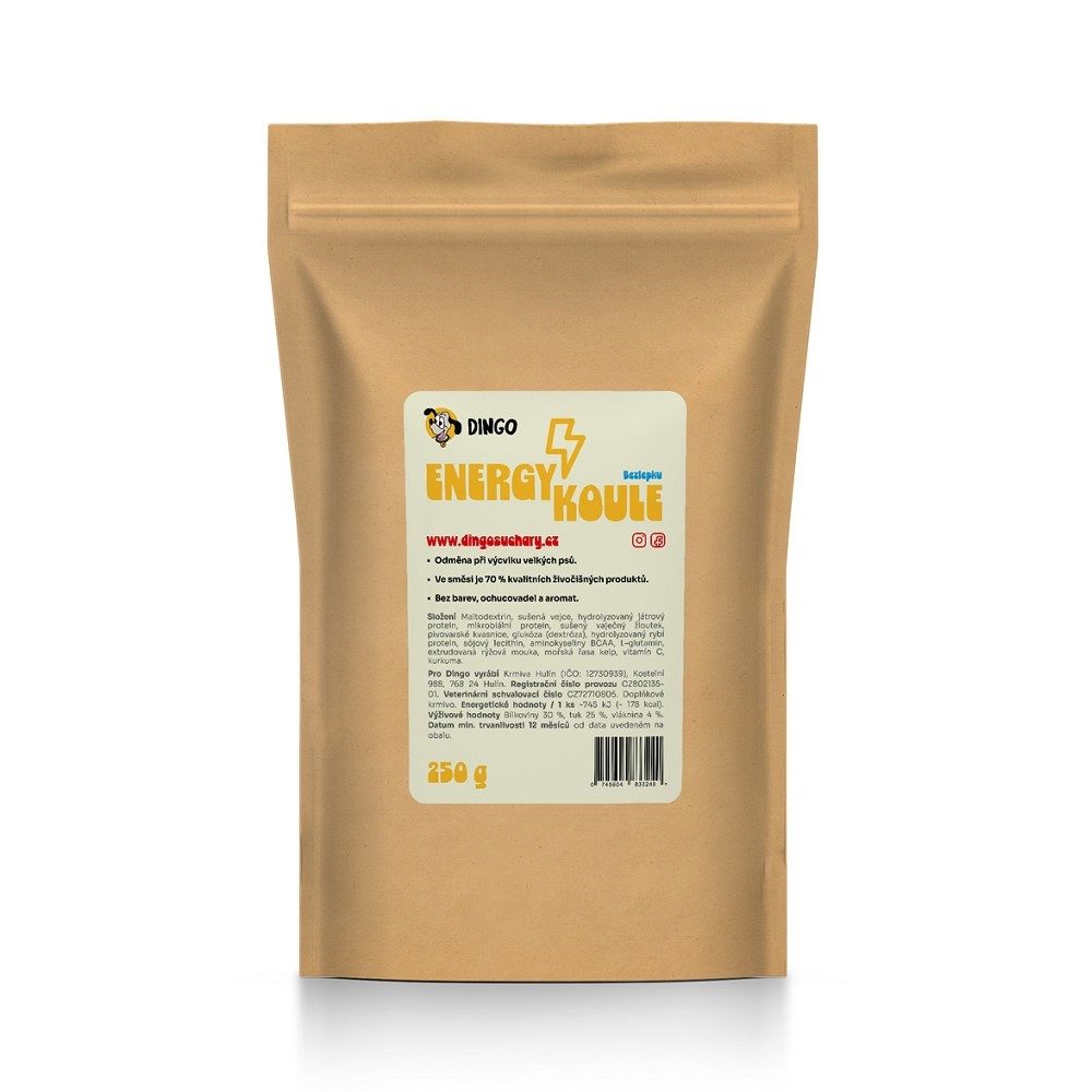 Charakteristika: DINGO Energy Koule je určena jako doplněk výživy pro psy v zátěži. Základní proteinové i tukové suroviny nepochází ze zdrojů pro lidskou sportovní výživu, ale jde o suroviny určené pro intenzivní výživu masožravých zvířat nebo jiné vhodné krmivářské doplňky pro výživu. Směs je určena pro rychlé obnovení svalového glykogenu při vysokém fyzickém zatížení psa a pro dodání lehce stravitelných proteinů, včetně specifické skupiny aminokyselin určených k ochraně svalových vláken před poškozením při přetížení.