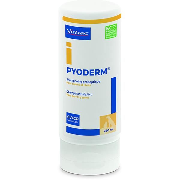 Šampon PYODERM® je antiseptický šampon pro psy a kočky účinný proti bakteriální a kvasinkové proliferaci. Šampon Pyoderm Virbac díky svému speciálnímu složení, které obsahuje chlorhexidin, působí proti bakteriím a kvasinkám.