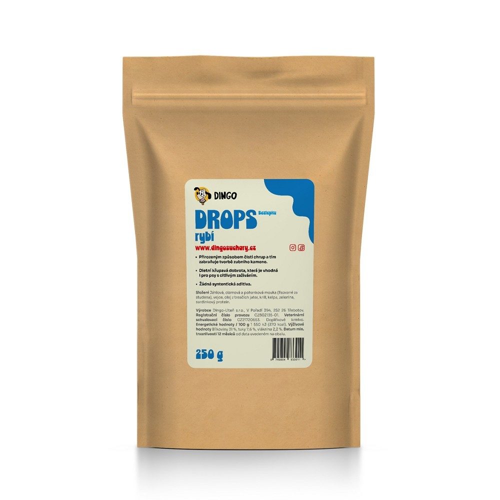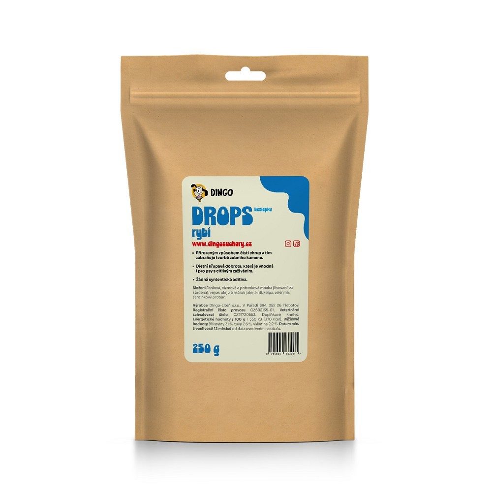 Pomalu pečené DINGO rybí bezlepkové drops jsou vyrobeny z kvalitních lokálních surovin. Přirozenou cestou čistí zuby vašeho mazlíčka a tím se zabraňuje tvorbě zubního kamene, jsou lehce stravitelné bez přidaných konzervantů a aditiv. Dietní křupavé pečivo je vhodné i pro psy s citlivým zažíváním.
