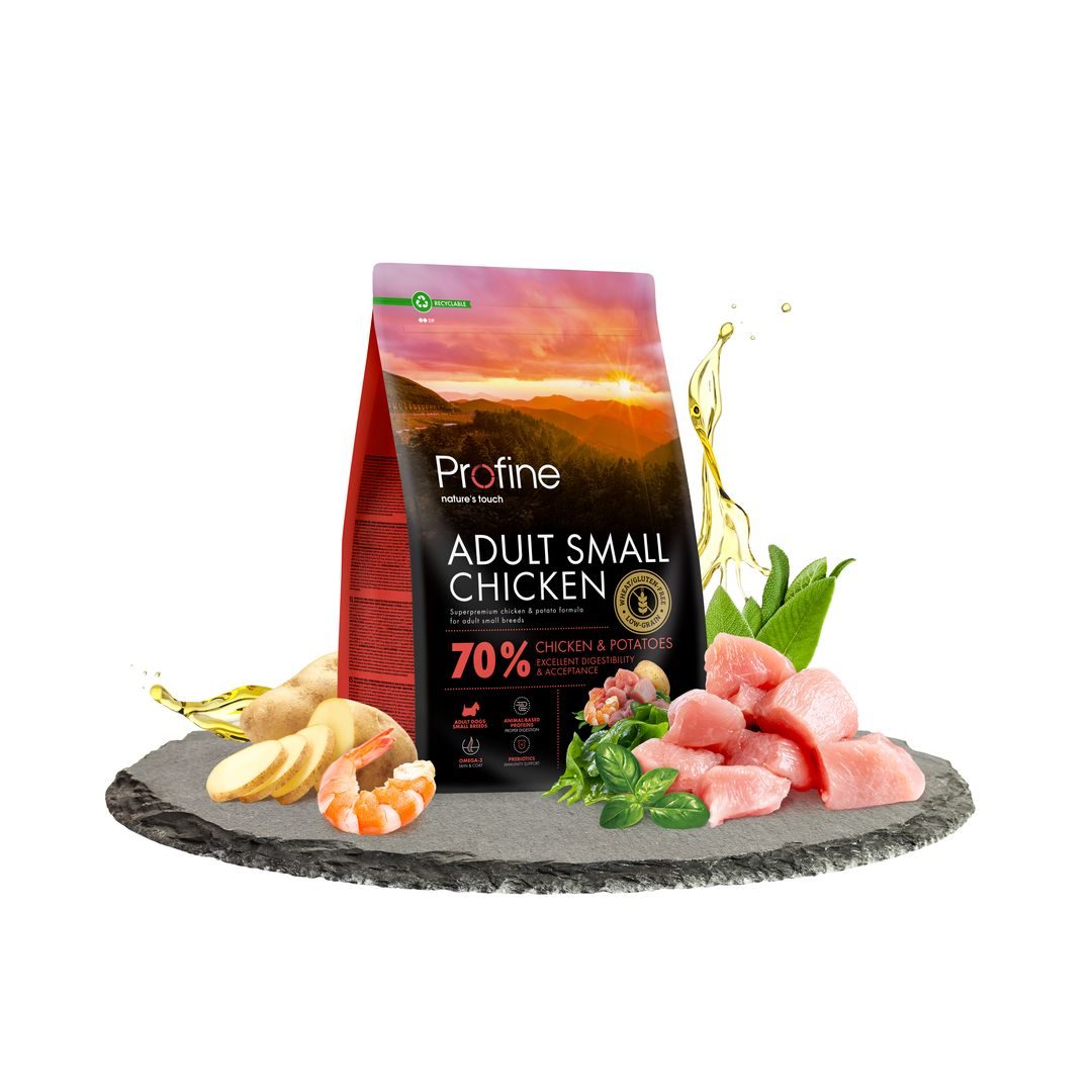 kuře 45 % (sušené kuře 25 %, kuřecí protein 20 %), kukuřice, brambory (14 %), kuřecí tuk (konzervován směsí tokoferolů, zdroj vitamínu E) (9 %), sušená jablka, pivovarské kvasnice, hydrolyzovaná kuřecí játra (2 %), krevetová moučka (1,5 %), lososový olej (1 %), sušené mořské řasy (0,5 %), hexametafosforečnan sodný (0,1 %), glukosamin (0,02 %), kořen čekanky (zdroj mannan-oligosacharidů 0,018 %), sušená směs bylin (fenykl, bazalka, šalvěj 0,018 %), frukto-oligosacharidy (0,012 %), juka schidigera (0,01 %), chondroitin sulfát (0,012 %), hřebíček (0,008 %). Analytické složky: hrubý protein 28,0 %, hrubý tuk 18,0 %, hrubá vláknina 2,5 %, vlhkost 10,0 %, hrubý popel 7,0 %, vápník 1,6 %, fosfor 1,1 %. Nutriční doplňkové látky v 1 kg: vitamín A (3a672a) 18000 IU, vitamín D3 (3a671) 1600 IU, vitamín E (3a700) 500 mg, cholinchlorid (3a890) 700 mg, biotin (3a880) 0,7 mg, niacinamid (3a314) 15 mg, D-pantothenan vápenatý (3a841) 12 mg, vitamín B12 (3a815) 0,05 mg, vitamín B2 (3a825i) 4 mg, vitamín B1 (3a820) 1,0 mg, vitamín B6 (3a831) 1,5 mg, kyselina listová (3a316) 0,6 mg, železo (3b107) 90 mg, zinek (3a612) 100 mg, měď (3b407) 18 mg, jodid draselný (3b201) 0,7 mg, mangan (3b505) 45 mg, selen (3b810) 0,2 mg, L-methionin (3c305) 15 mg, L-lysin (3c322) 3 mg.