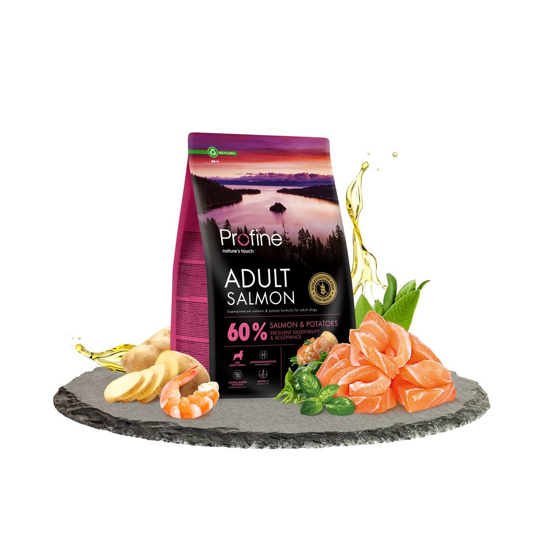 losos 37 % (sušený losos 22 %, lososový protein 15 %), kukuřice, brambory (20 %), kuřecí tuk (konzervován směsí tokoferolů, zdroj vitamínu E), sušená jablka, pivovarské kvasnice, lososový olej (3 %), hydrolyzovaná kuřecí játra, krevetová moučka (1,5 %), sušené mořské řasy (0,5 %), glukosamin (0,02 %), kořen čekanky (zdroj mannan-oligosacharidů 0,018 %), sušená směs bylin (fenykl, bazalka, šalvěj 0,018 %), frukto-oligosacharidy (0,012 %), juka schidigera (0,01 %), chondroitin sulfát (0,012 %). Analytické složky: hrubý protein 24,0 %, hrubý tuk 14,0 %, hrubá vláknina 2,0 %, vlhkost 10,0 %, hrubý popel 5,2 %, vápník 1,0 %, fosfor 0,8 %. Nutriční doplňkové látky v 1 kg: vitamín A (3a672a) 18000 IU, vitamín D3 (3a671) 1600 IU, vitamín E (3a700) 500 mg, cholinchlorid (3a890) 700 mg, biotin (3a880) 0,7 mg, niacinamid (3a314) 15 mg, D pantothenan vápenatý (3a841) 12 mg, vitamín B12 (3a835) 0,05 mg, vitamín B2 (3a825i) 4 mg, vitamín B1 (3a820) 1,0 mg, vitamín B6 (3a831) 1,5 mg, kyselina listová (3a316) 0,6 mg, železo (3b107) 90 mg, zinek (3b312) 100 mg, měď (3b407) 18 mg, jodid draselný (3b201) 0,7 mg, mangan (3b505) 45 mg, selen (3b810) 0,2 mg, L methionin (3c305) 15 mg, L-lysin (3c322) 3 mg.