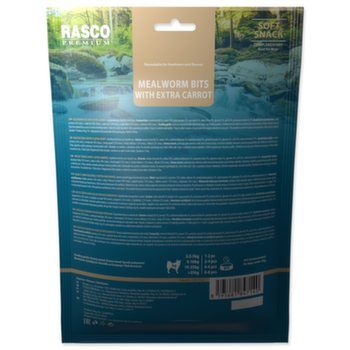 Složení: Mouční červi 68,5%, mrkev 15%, rostlinná bílkovina 5%, kukuřičný škrob 5%, pšeničná mouka 3%, glycerin 3%, sůl 0,4%, sorbát draselný 0,1%.