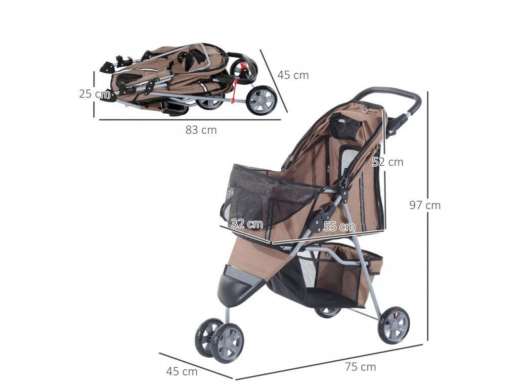 Kočárek pro psy do 10kg, 2 držáky na láhve, ocelový rám, potah z tkaniny Oxford, sklápěcí střecha proti slunci, přední síťovaná dvířka na zip, zadní dvířka s taškou na zip, uvnitř 2 bezpečnostní vodítka, dvojitá otáčecí přední kola, 2 dvojitá pevná zadní kola s brzdami, vnitřní rozměry s baldachýnem 55x32x52cm, celkové rozměry kočárku 75x45x97cm.