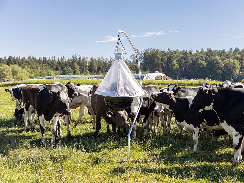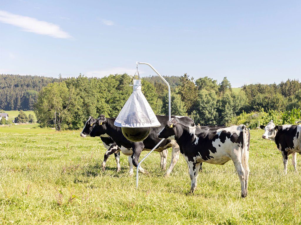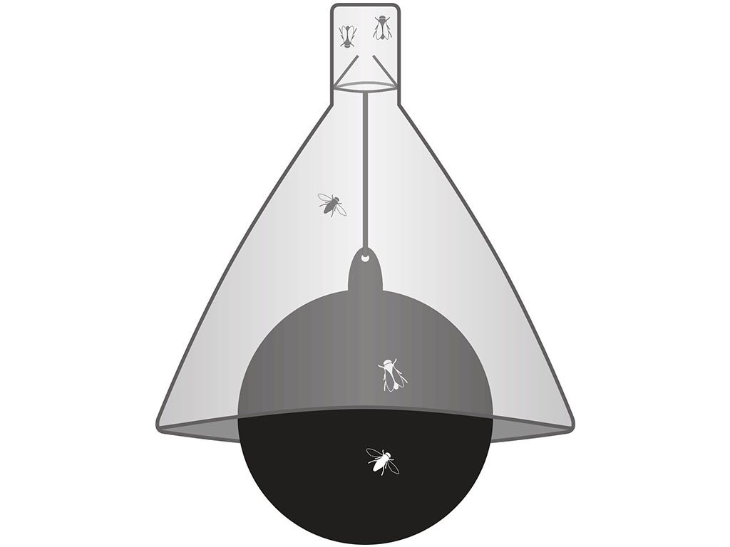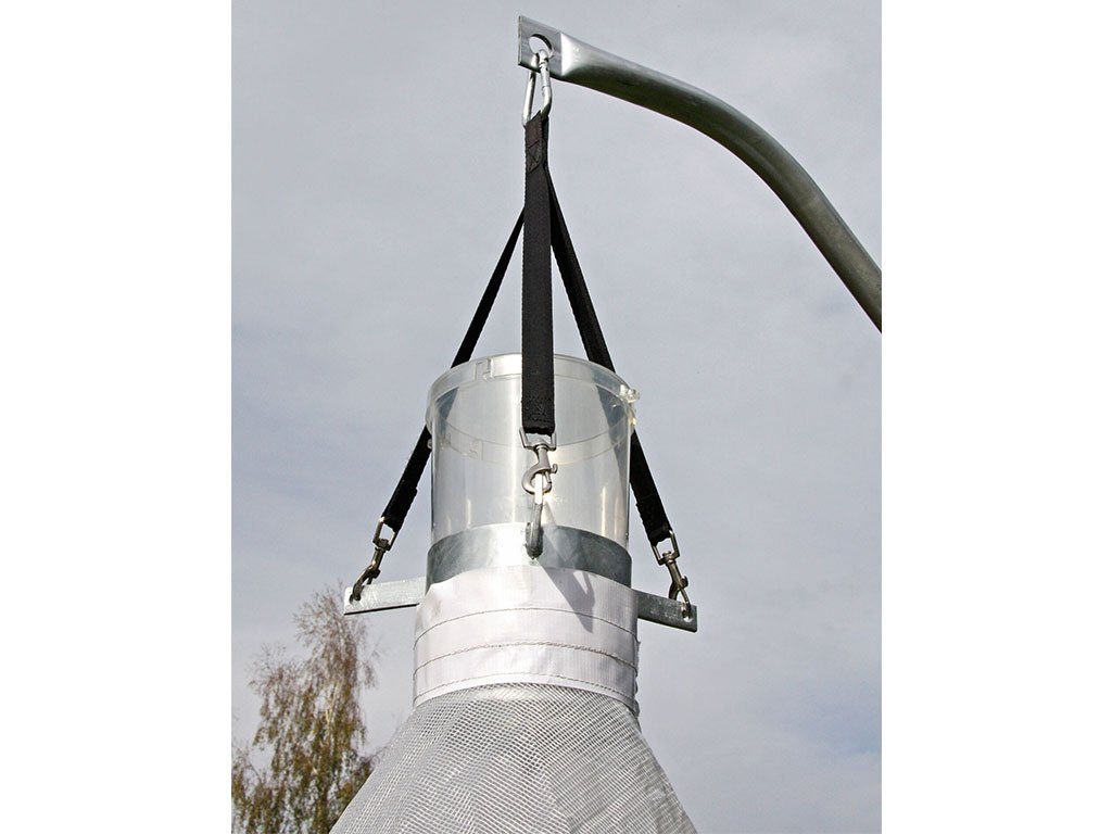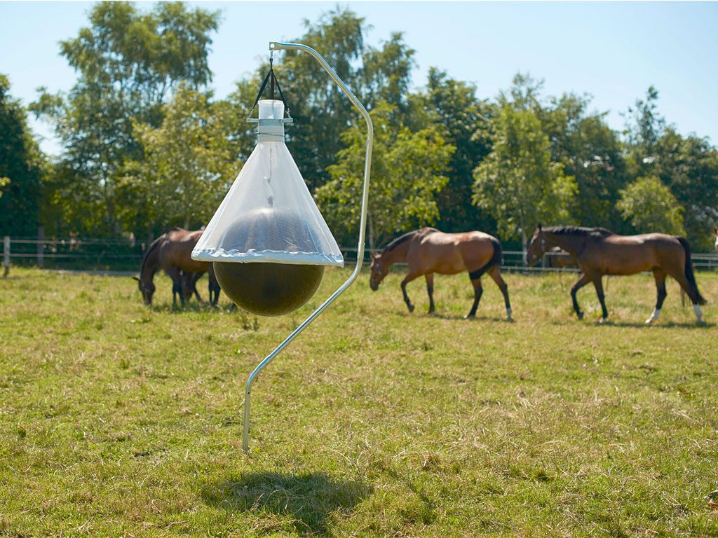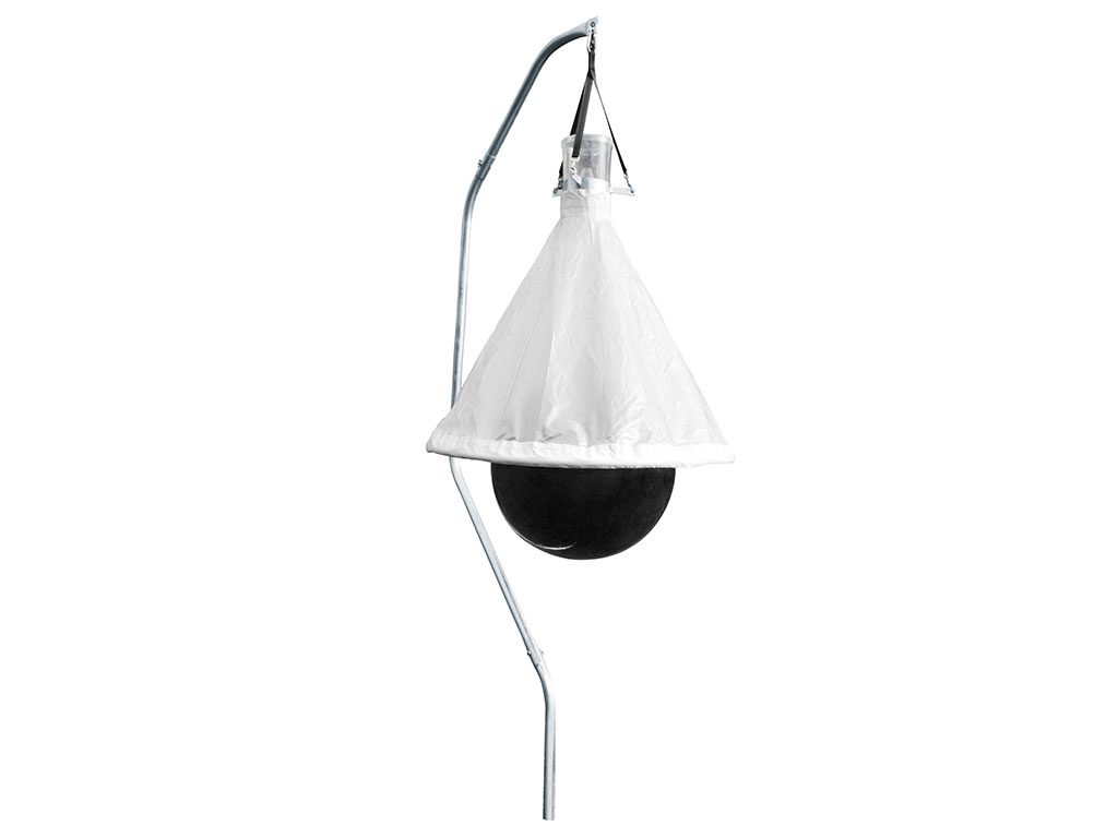 Závěsný lapač ovádů se stojanem, pro plochy do 10 000 m2, do ohrad, stájí, zahrad, výběhů, kempů, hřišť, parků a na stromy, šetrné k životnímu prostředí, průměr cca 1,20 m, hmotnost cca 18 kg.