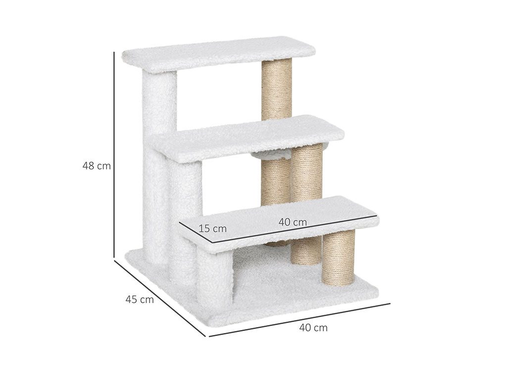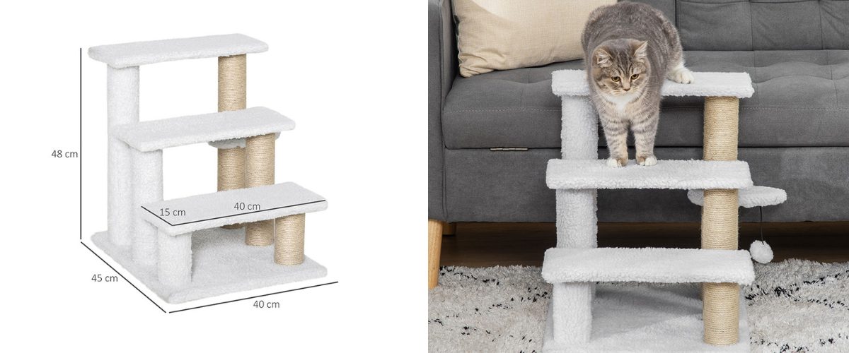 Schůdky pro psy a kočky, třístupňové, pro snadné lezení, podšité měkkým plyšem, s odolným škrabadlem, s měkkým míčkem, rozměry schodu 40x15 cm, celkové rozměry 45x40x48 cm.