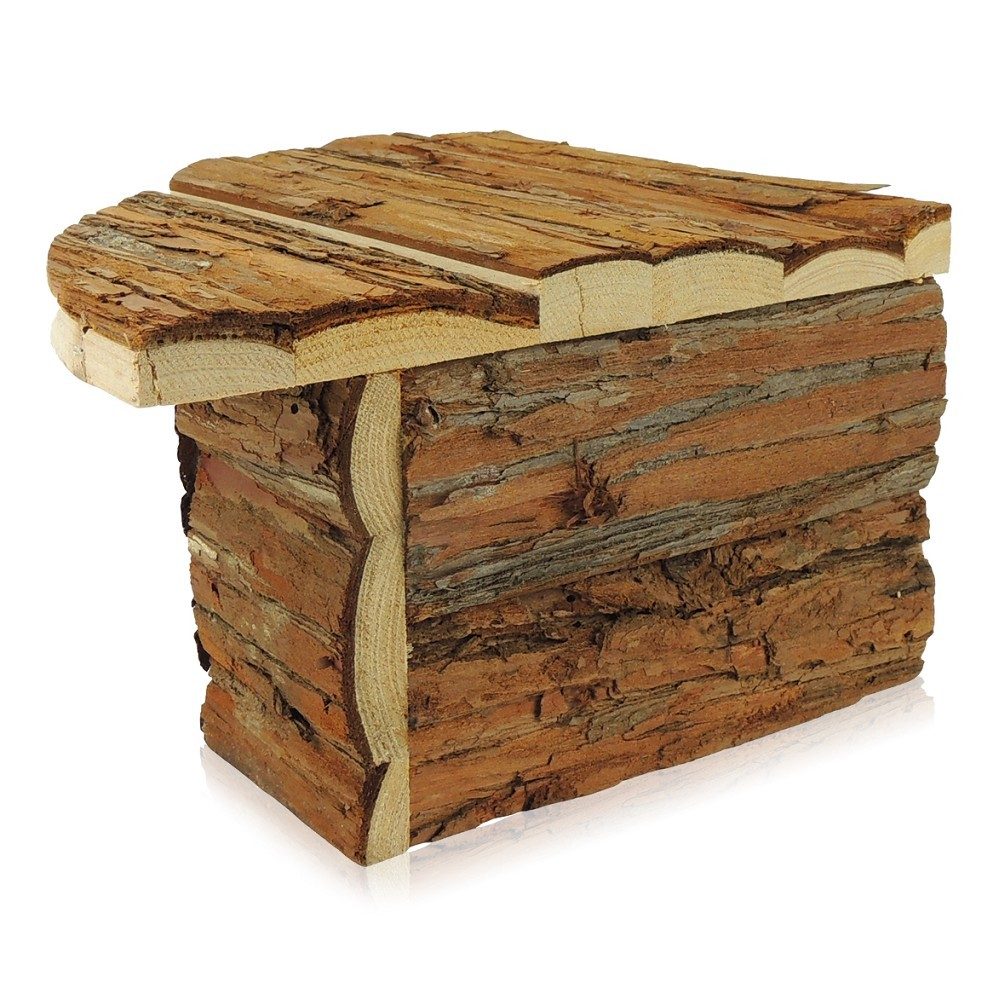 Díky rohovému tvaru efektivně šetří místo v kleci a zároveň poskytuje dostatek prostoru pro odpočinek a úkryt. Tento domek je vyroben z jedlového dřeva s kůrou, což mu dodává přirozený vzhled, který ladí s přírodním prostředím zvířete.