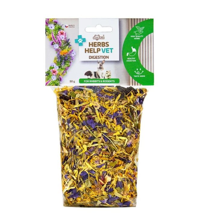 Čistě přírodní směs je tvořená výhradně bylinami, které mají pozitivní vliv na trávení a podporují správné zažívání u králíků a dalších drobných savců. Ideální jako doplněk stravy nebo zdravý pamlsek.