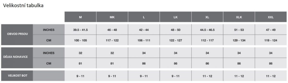 - zakončení prsaček elastickým páksem, který má navíc ocelový háček k přichyení na tkanički brodících bot, ochrana proti vniknutí štěrku a nečistot do bot