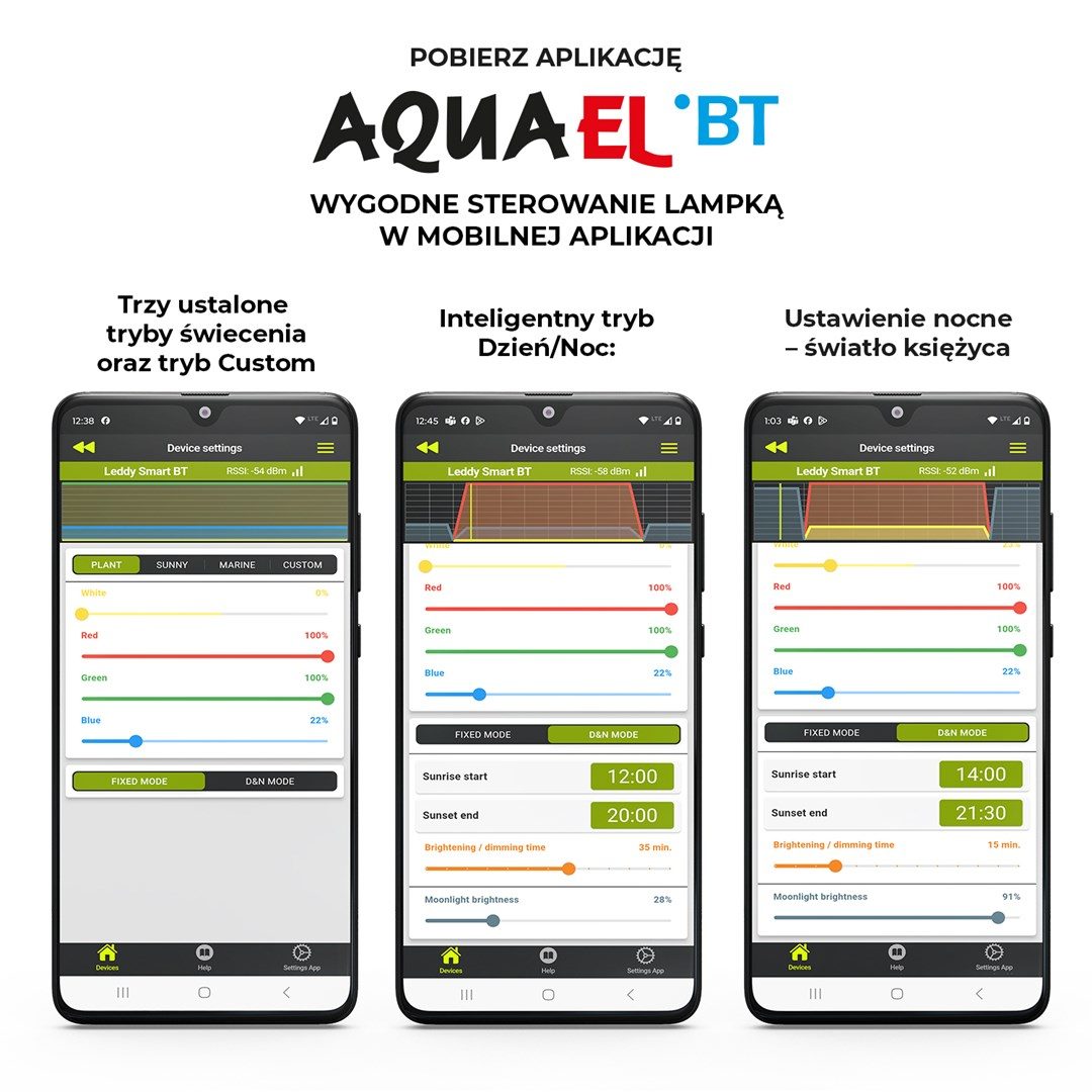 S aplikací Aquael BT pro Android nebo IOS máte k dispozici dálkové ovládání osvětlení akvária. Umožňuje vám komunikovat s lampou prostřednictvím mobilních zařízení, jako je chytrý telefon nebo tablet, pomocí technologie Bluetooth. Aplikace umožňuje dálkově nastavit parametry osvětlení - například intenzitu, teplotu barev nebo dobu svícení - podle individuálních požadavků vaší nádrže. Pomocí ní je také možné ovládat několik lamp a sdílet přístup mezi dalšími osobami. Aquael BT lze zabezpečit pomocí kódu PIN.